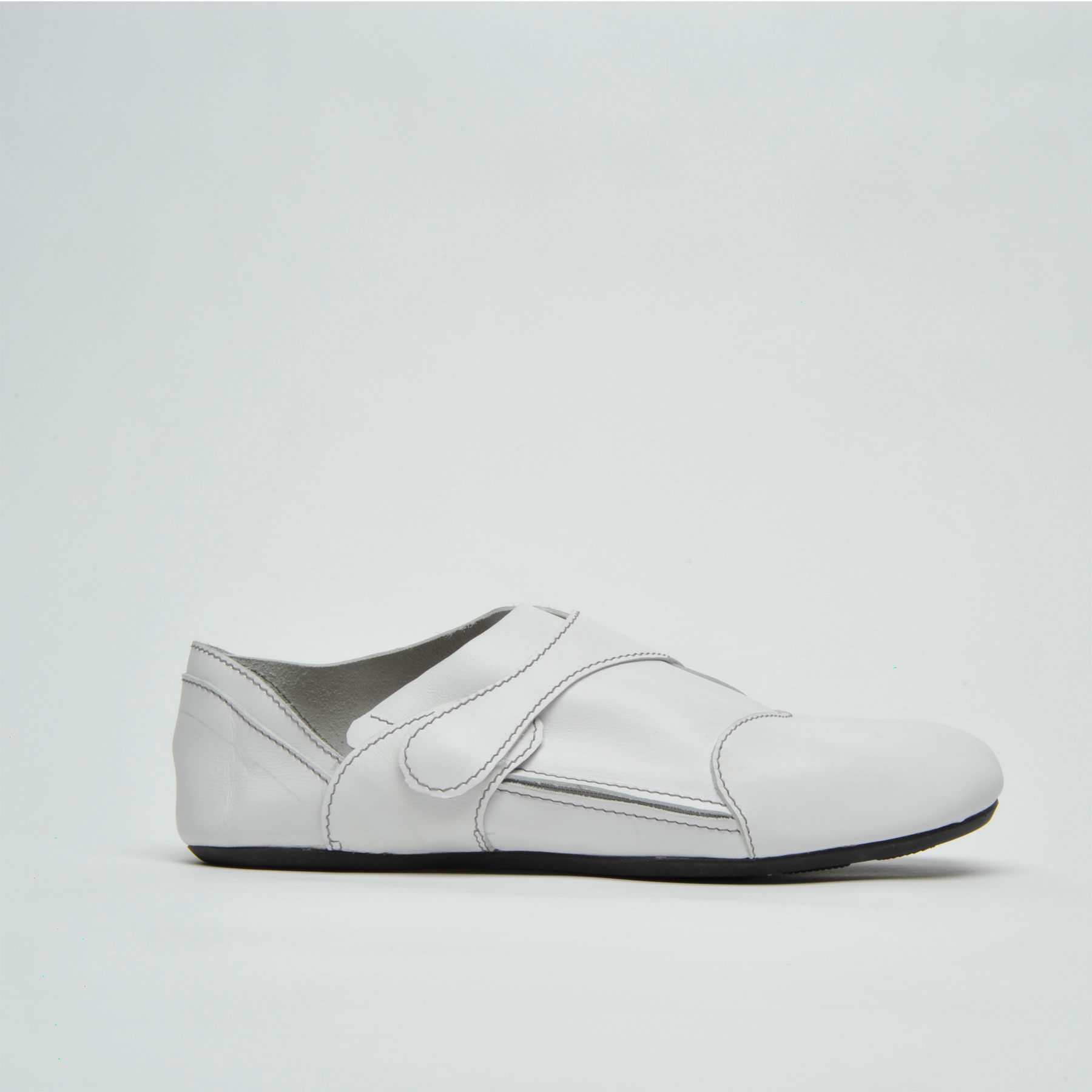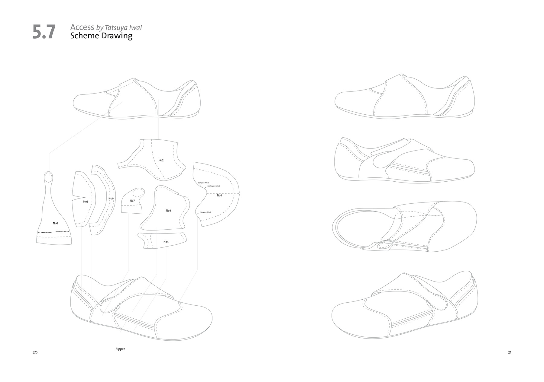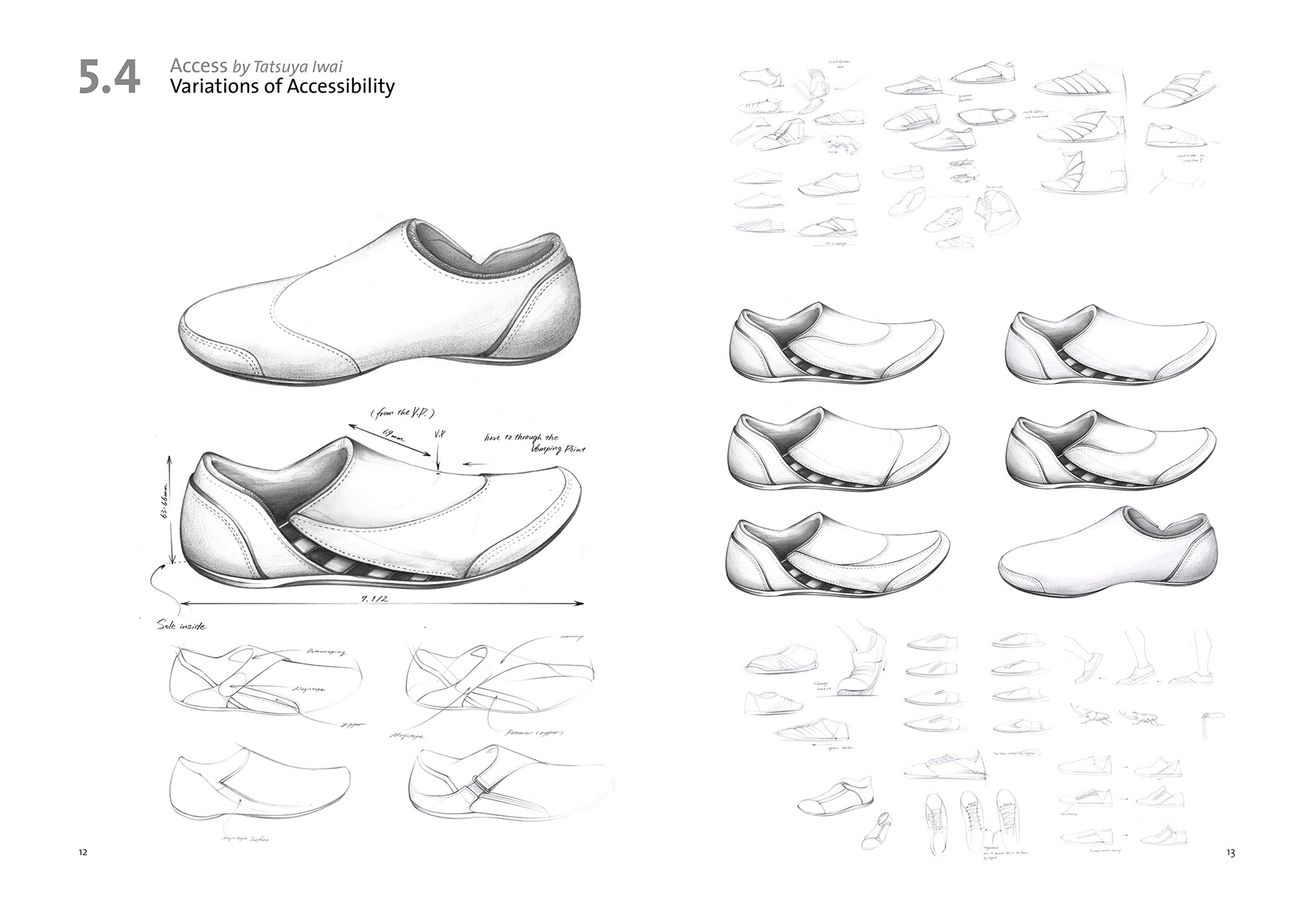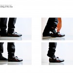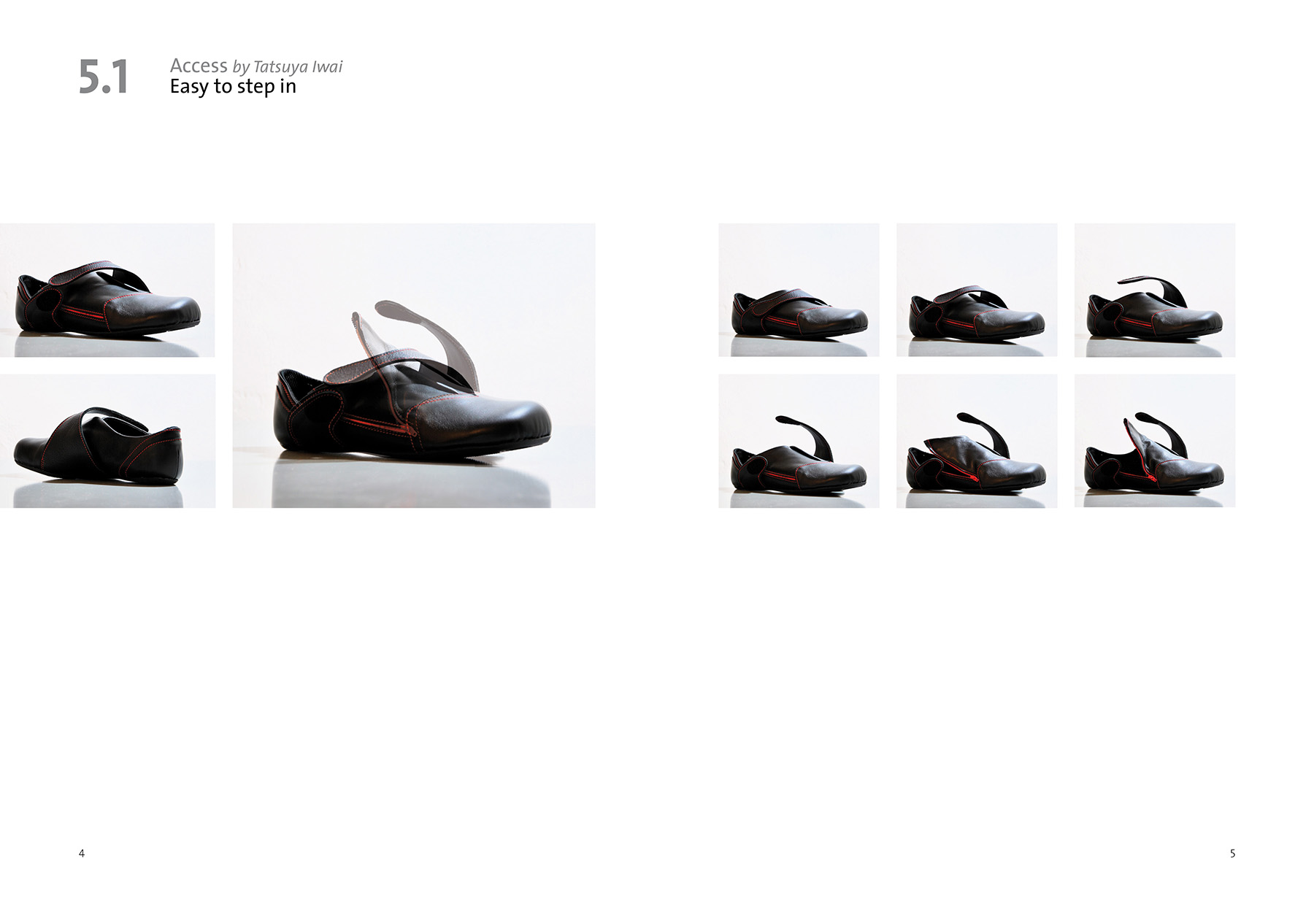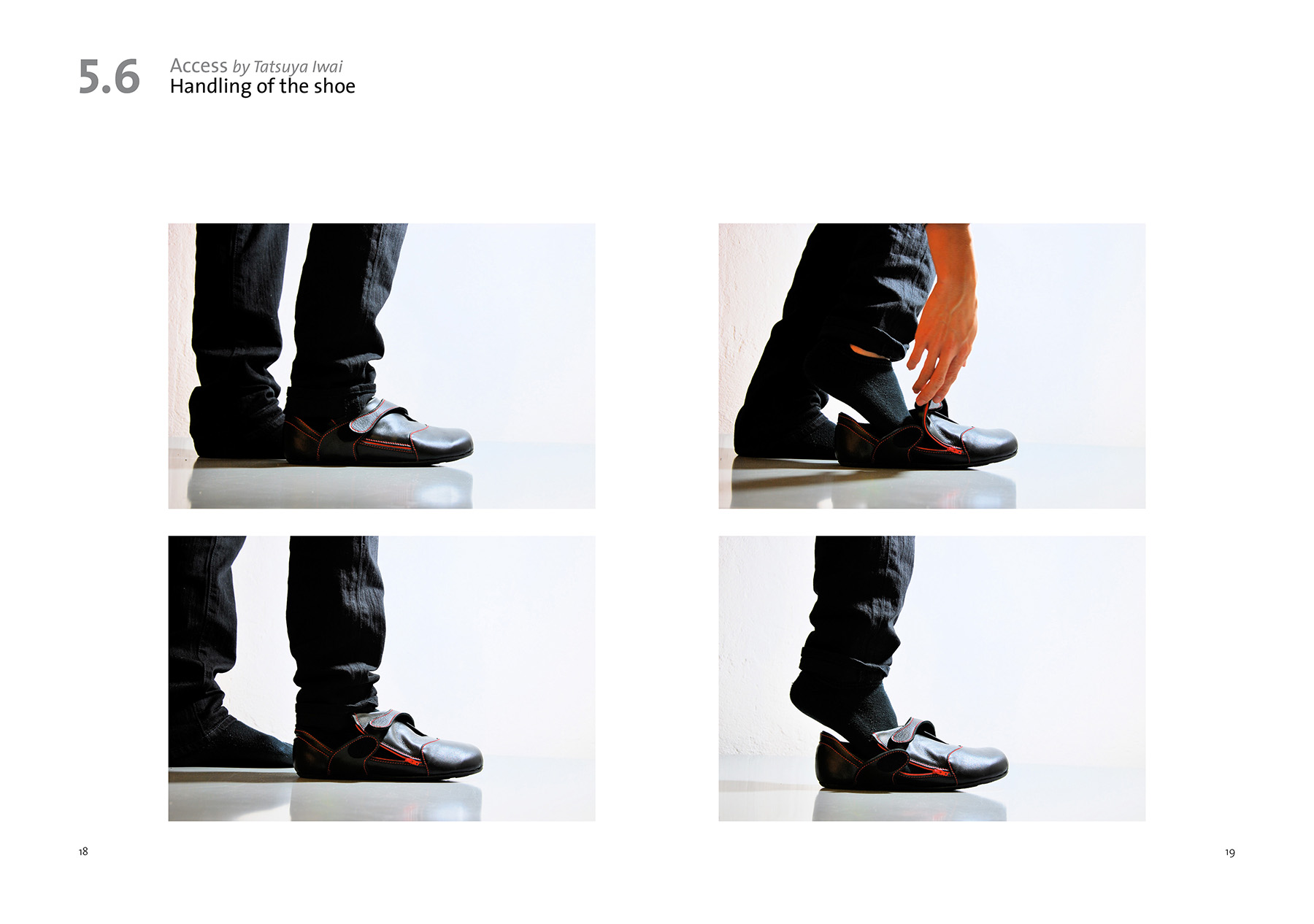 We often have to take on and off our shoes during daily life which can be inconvenient in some situations. My idea was to broaden the access to the shoe from above to the side to offer a wider opening for stepping into the shoe. At the same time the shoe needs to be adjustable to guarantee a strong hold around the ankle and instep point. The shoe can be opened up widely by using the zipper on its side. To adjust the shoe to the individual foot a belt running over its top can be fixed in various positions with the help of magic tape.