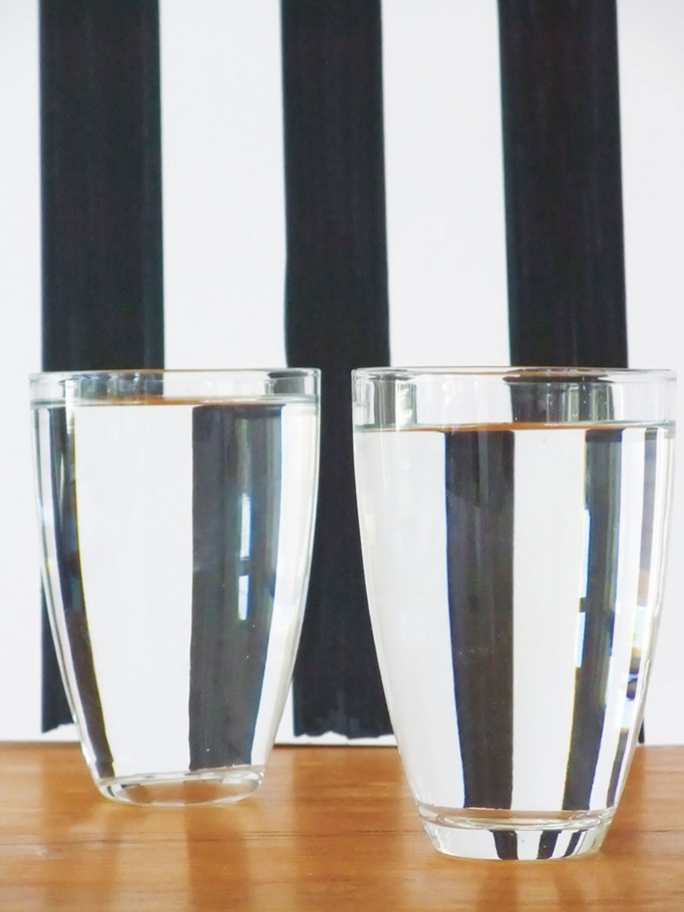 Das mit Wasser gefüllte Glas erzeugt Vergrösserungen und Verzerrungen der Hintergründe und bringt unerwartete Muster hervor. Auf dem gedeckten Tisch entstehen weitere Spiegelungen, die nicht auf den ersten Blick ersichtlich sind. Dem Betrachter wird ermöglicht, seine eigenen Stillleben aus diversen Perspektiven zu bilden.
