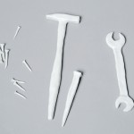Bonum Plus ist die Idee einen unvollständigen Werkzeugkasten der Firma Bonum mit Porzellanobjekten zu ergänzen. Die dafür entstandenen Werkzeuge aus weißem, fragilem Hartporzellan scheinen in diesem Kontext zunächst fremd. Was mich aber sehr an dieser Kombination reizte ist, dass Porzellan auf der einen Seite natürlich so zerbrechlich ist, dass es wohl nie eine Verwendung im Werkzeugkasten finden wird, aber auf der anderen Seite wiederum so hart ist, dass man die klassischen Stahlwerkzeuge des Werkzeugkastens an ihm schleifen kann.