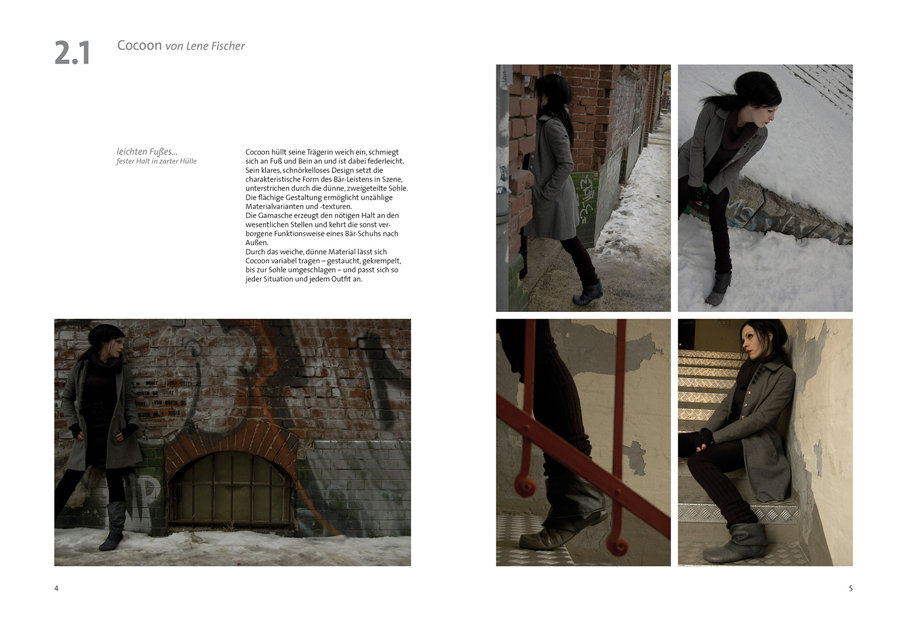 Die Gamasche erzeugt den nötigen Halt an den wesentlichen Stellen und kehrt die sonst verborgene Funktionsweise eines Bär-Schuhs nach Außen. Durch das weiche, dünne Material lässt sich Cocoon variabel tragen – gestaucht, gekrempelt, bis zur Sohle umgeschlagen – und passt sich so jeder Situation und jedem Outfit an.