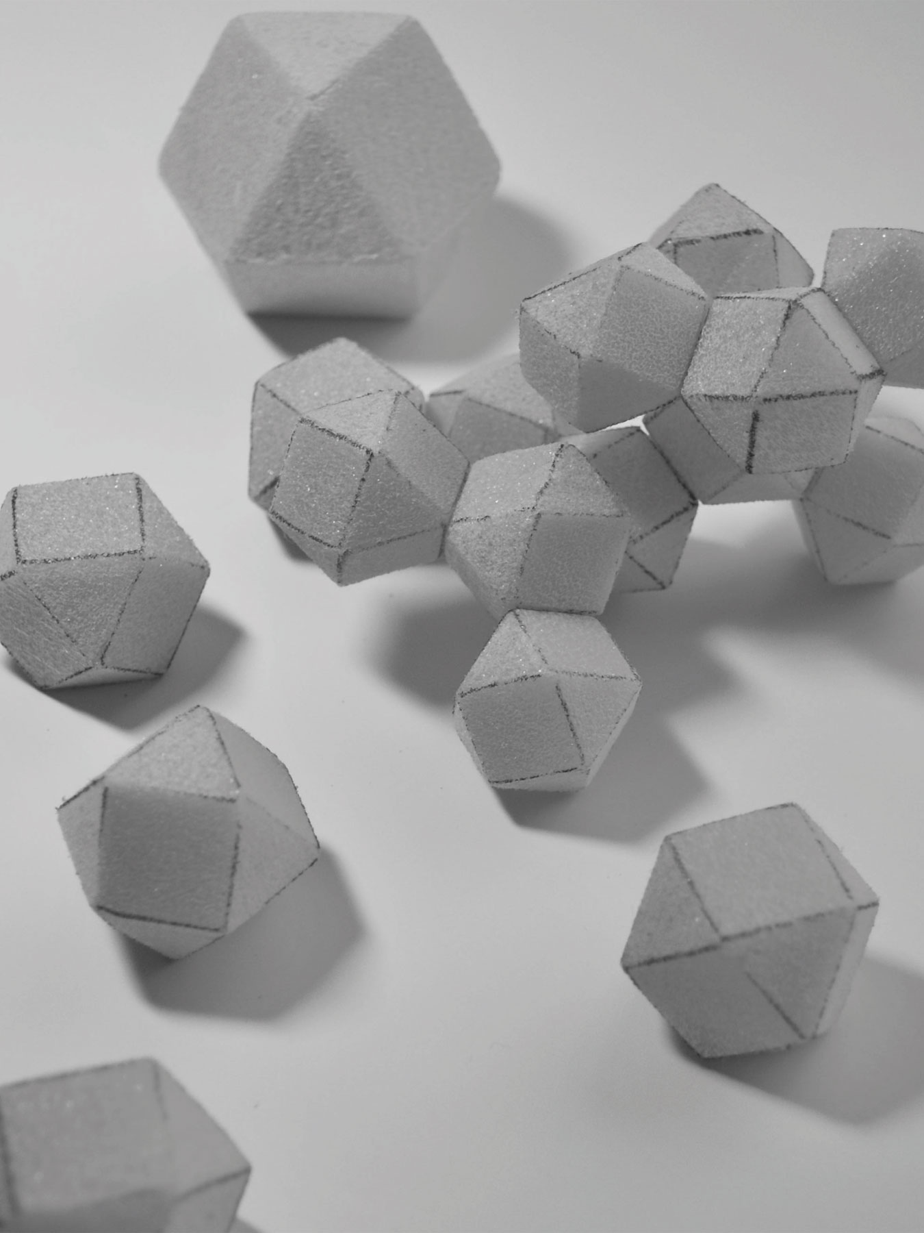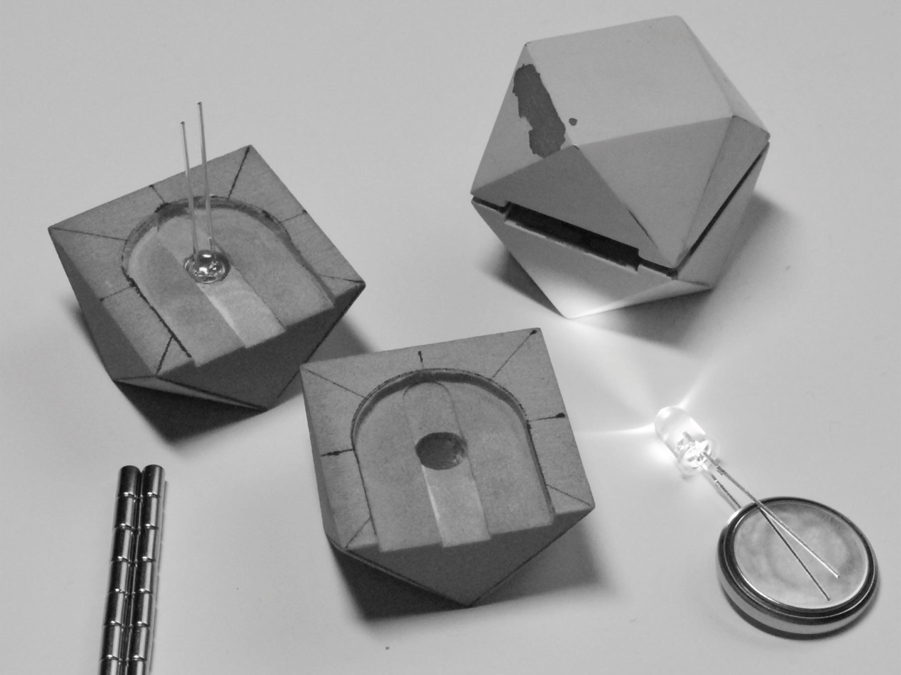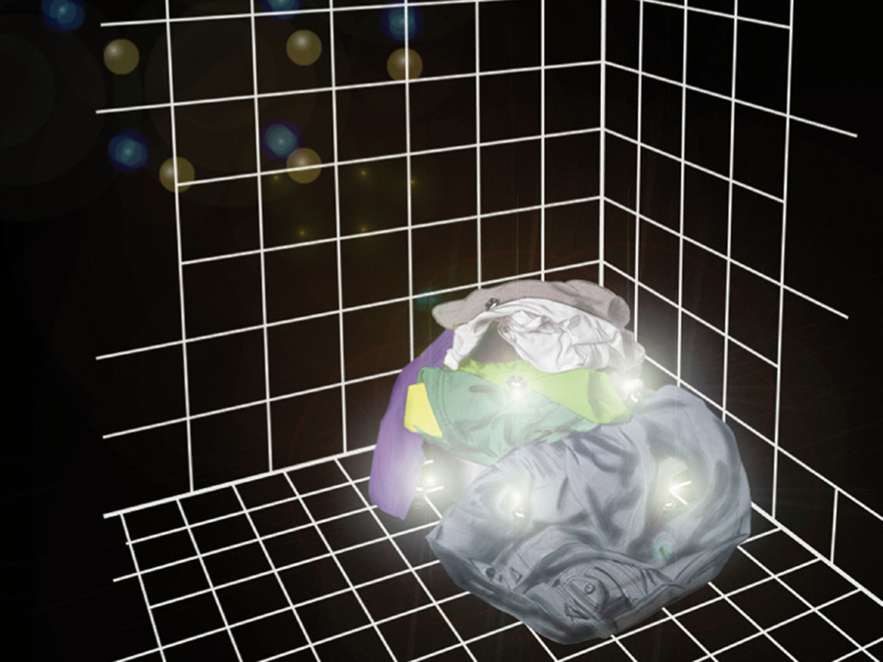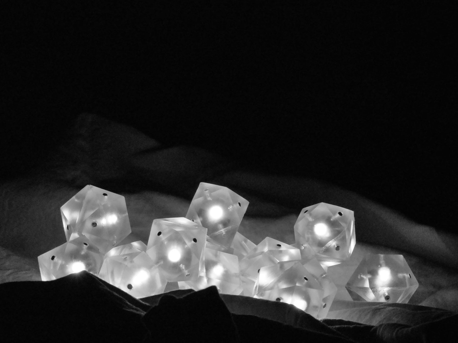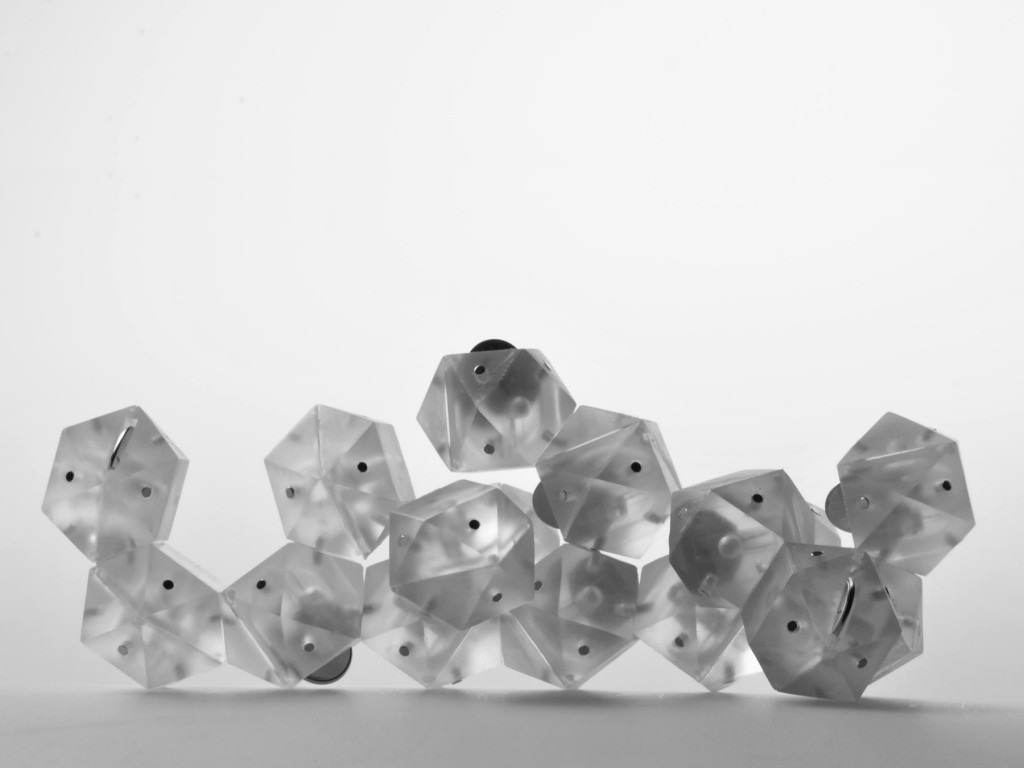 Die äußere Struktur des Granulates ermöglicht die Rundumabstrahlung. Dadurch wird eine große Effizienz des Lichtes in der Aktivierung des fotokatalytischen Prozesses auf den Ti02 imprägnierten Textilien gewährleistet. Die einzelnen Elemente können magnetisch miteinander verbunden werden. Je nach Arbeitsschritt können die Magneten an- bzw. ausgeschaltet werden.