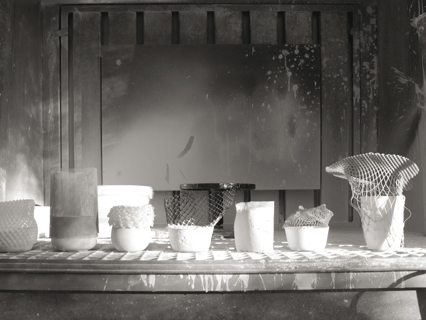 Ergebnis der Auseinandersetzung ist das Vasen-Duo Légumes. Gefangen, bewahrt, geschützt, verbunden. Unser edeles Porzellan verbindet sich mit dem sonst unscheinbaren Verpackungsnetz aus dem Supermarkt ohne seinen Wert einzubüßen. Im Gegenteil, neben der visuellen Erfahrung beginnt ein poetisches Spiel zwischen den Gegensätzen. Zweig und Vase verbinden sich. Das Netz legt sich wie eine schützende Haut um die sich gegenseitig vervollständigenden Elemente. Es entsteht eine Spannung zwischen innen und außen, eine Verbindung zwischen Raum und Vase, Vase und Blume. Die Form der Vasen wird durch die Spannung des Netzes visuell erfahrbar, Kanten werden weicher, und die Form bekommt eine weitere Dimension.