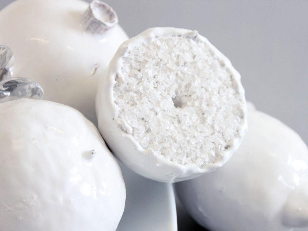 Ziel war es ein Objekt zu entwerfen, welches seinen Ursprung in einem Stillleben der Ölfarbenmalerie hat. Das Stillleben ist geprägt von monochromen Materialien unterschiedlicher Viskosität und Haptik. Als Inspiration für das fertig entworfene Objekt dienten Silikon, Gips, Zuckerkristalle und Porzellan. Desweiteren sind es natürliche,runde Formen, Zitrusfrüchte, Granatäpfel und Strukturen der Zuckerkristalle. Kleinteile, die durch ihr Zusammenfinden ein neues Ganzes ergeben, waren ausschlaggebend für meinen Entwurf. Pila ist ein kleiner Ball bestehend aus 20 hexagonalen und 12 pentagonalen, handgefertigten Formen aus Porzellan.