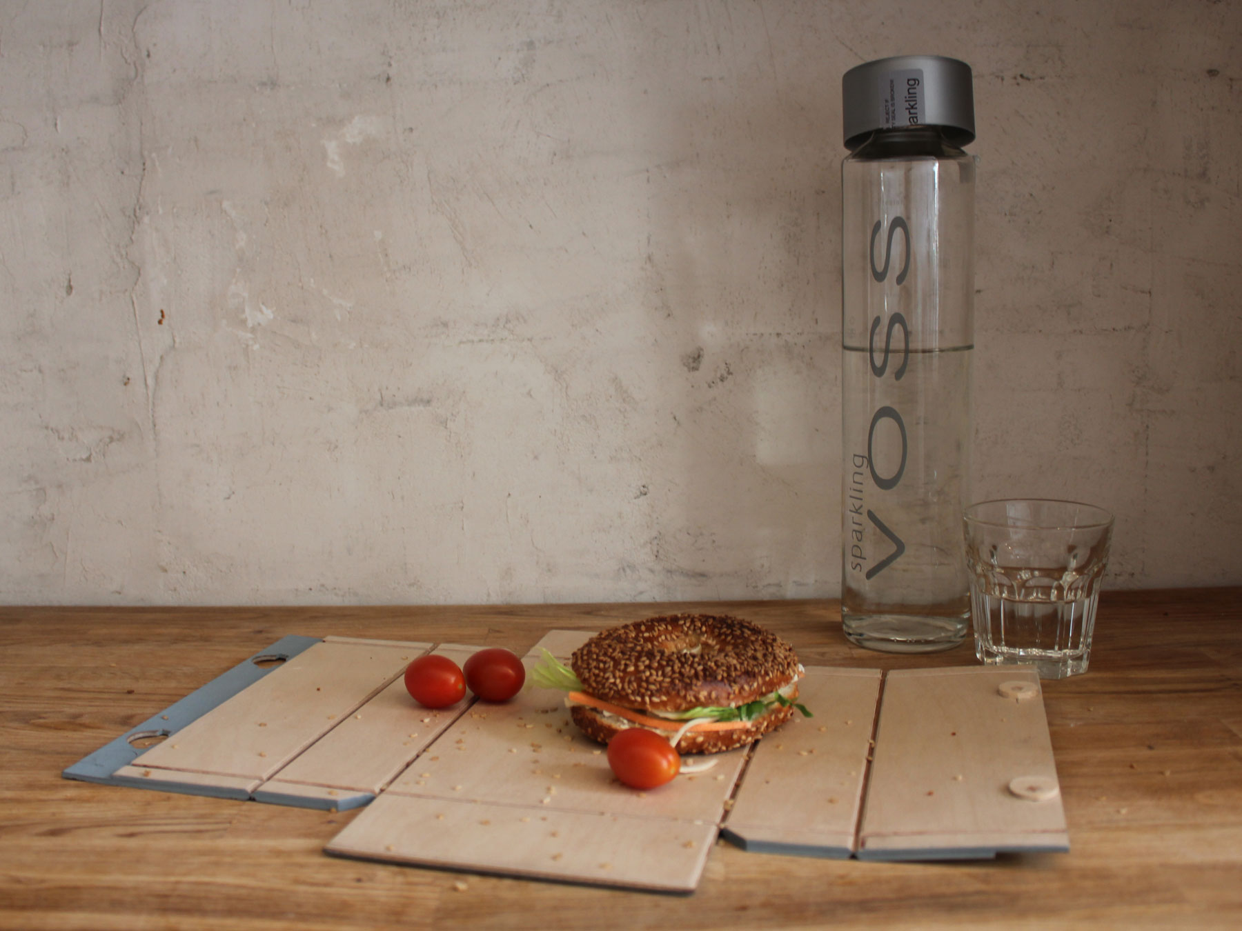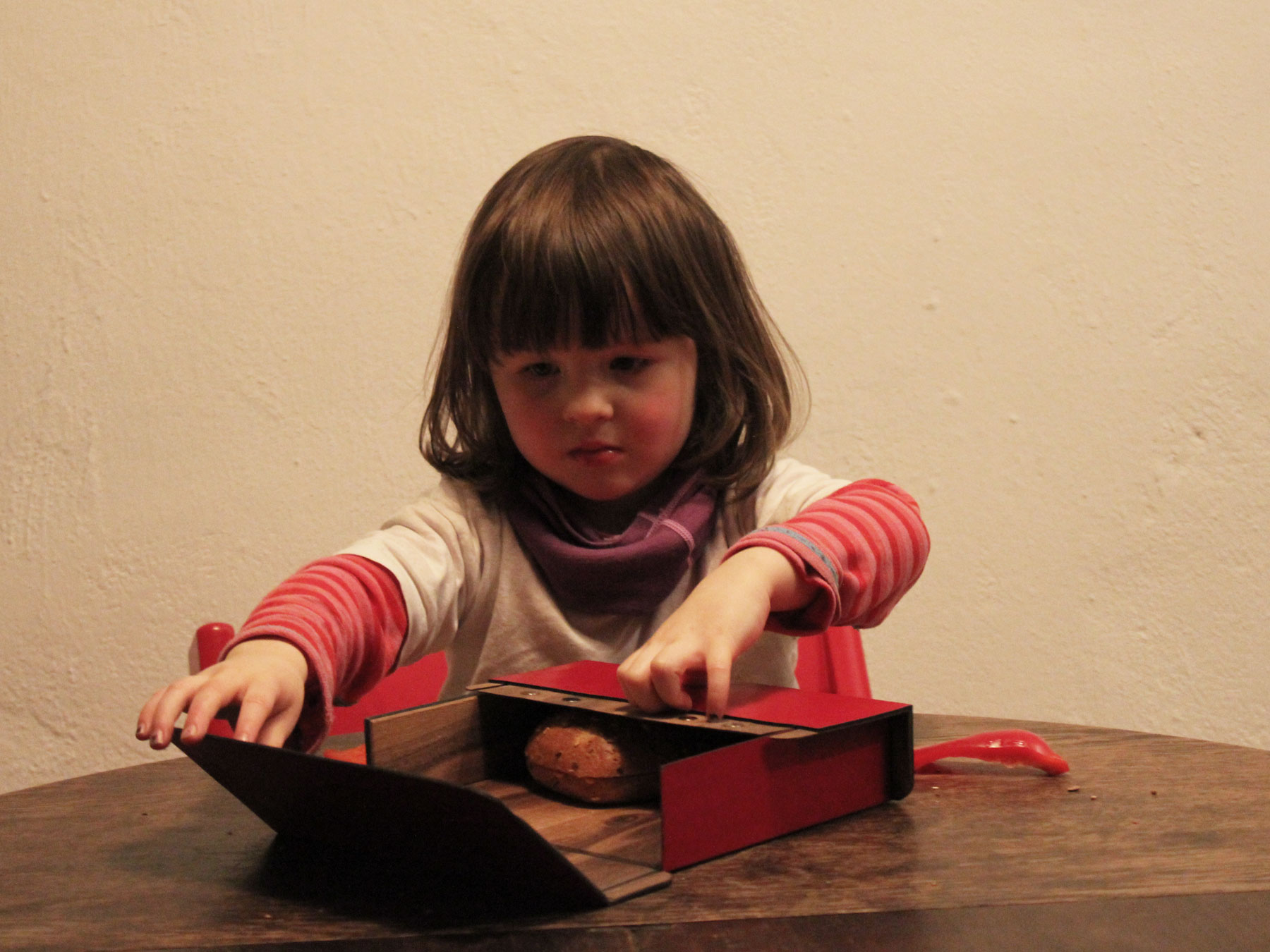 Die Einteilige Lunchbox kann individuell aus unterschiedlichen Materialsandwichen bestehen, das Material wird durch V-förmige Einfräsungen zum Scharnier und ermöglicht so den Klappeffekt.