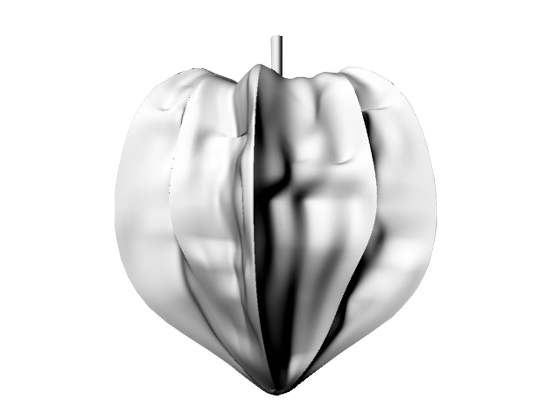 Beim Untersuchen der Makroaufnahmen einer Physalis bemerkte ich die interessanten Umrisse und fokussierte im weiteren Verlauf der Studie mein Augenmerk auf dieses Detail. Schrittweise gelang ich zu einem Schalenaufbau, bei dem ein Längsschnitt die Aufsicht auf die Schale darstellt und sich noch mehrere Mal in der Form wiederholt.