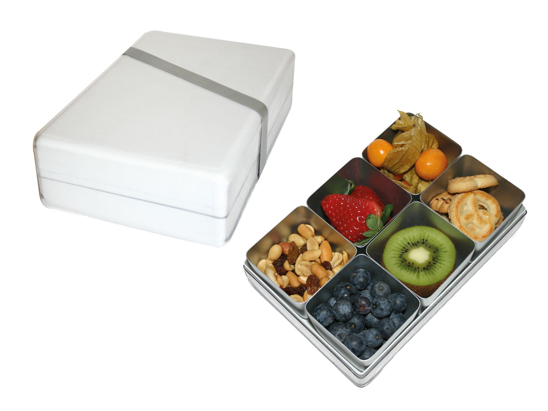 Mit Take a snack ist es möglich, sein Essen variabel und getrennt voneinander mit zu nehmen. Durch ein Sortierungs-System in Form von unterschiedlich großen Einsätzen kann man sich einevollwertige und abwechslungsreiche Mahlzeit zusammenstellen, ohne das die unterschiedlichen Nahrungsmittel den Geschmack voneinander annehmen.