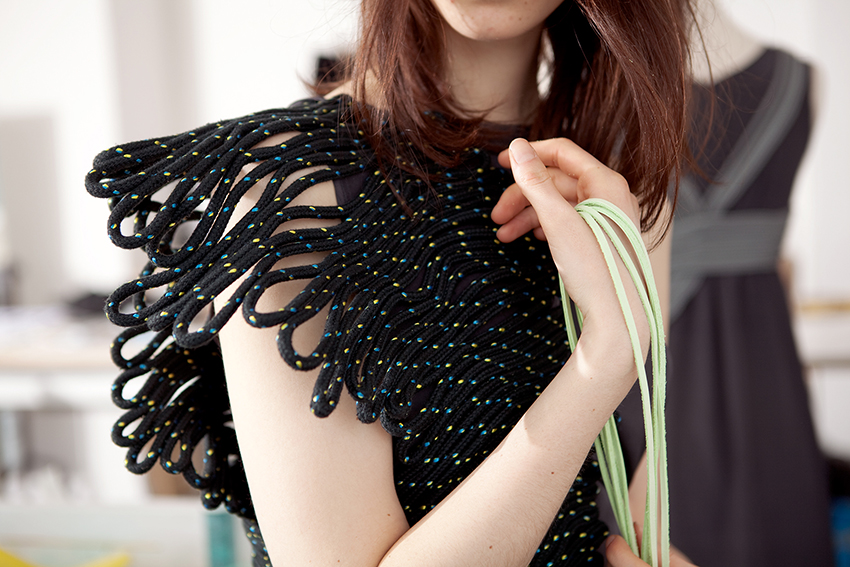 Printed One and Printed Two are the results of an exploration into the possibilities of appropriating the principles of this type of 3D printing in fashion manufacturing. The outer surfaces of the dresses are produced in a hand making process whereby a continuous strand of rope is draped across the body form. By selecting and sometimes changing the direction of the rope certain parts of the body are high-lighted and emphasis curves, muscles and or bone structures.