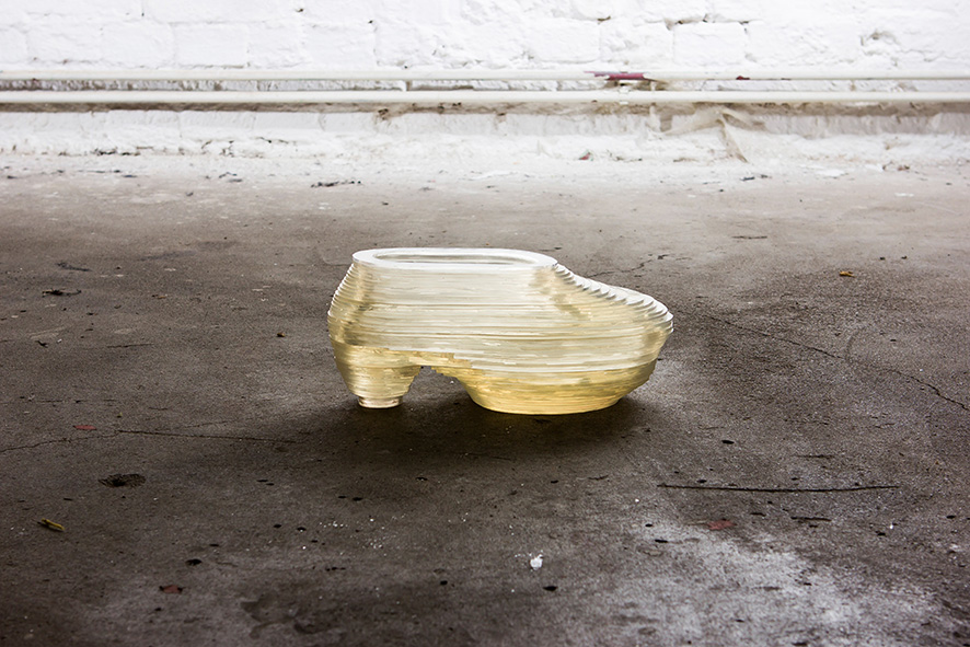 The project consists of a series of shoes that leave human traces behind on the surface of the moon. The shoes are made from layered Soft PVC and flexible Foam. They sit somewhere between a machine made footprint and an artificial rock.