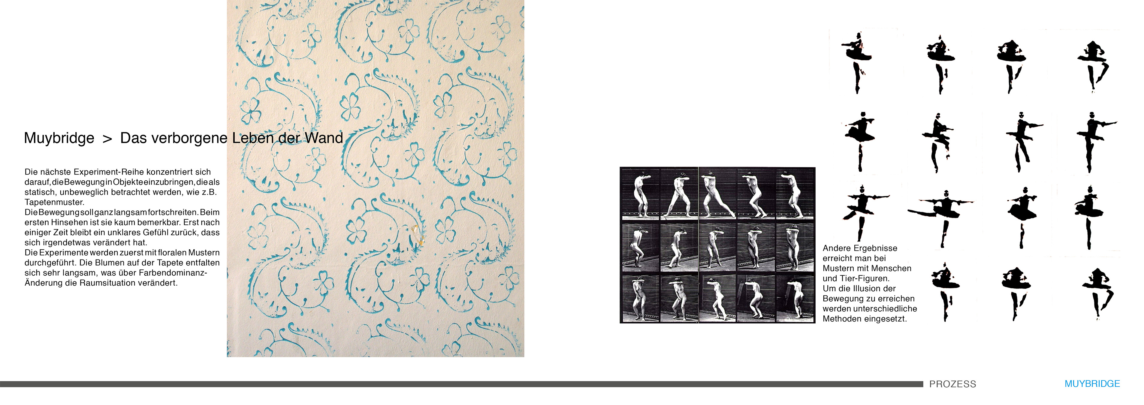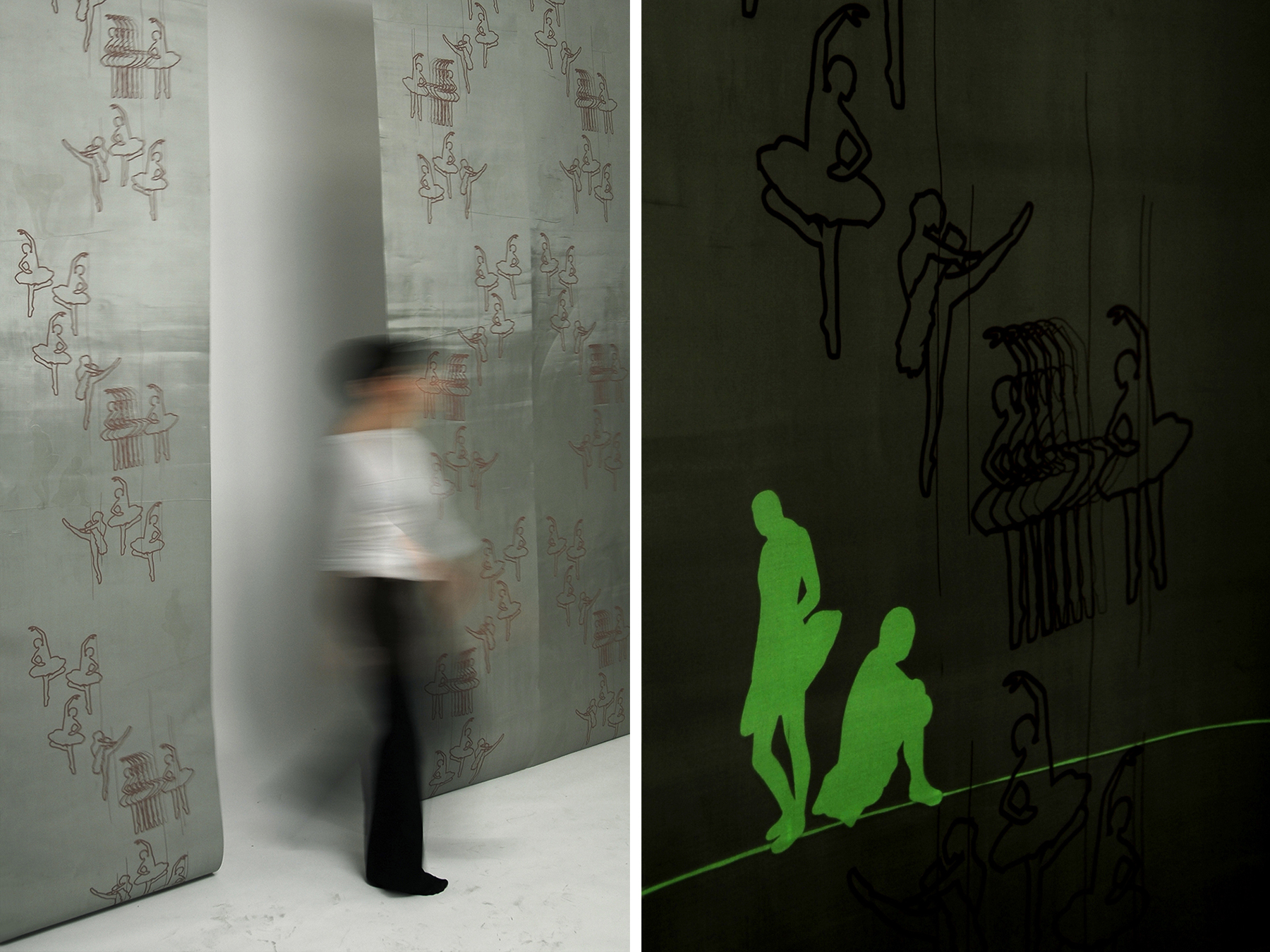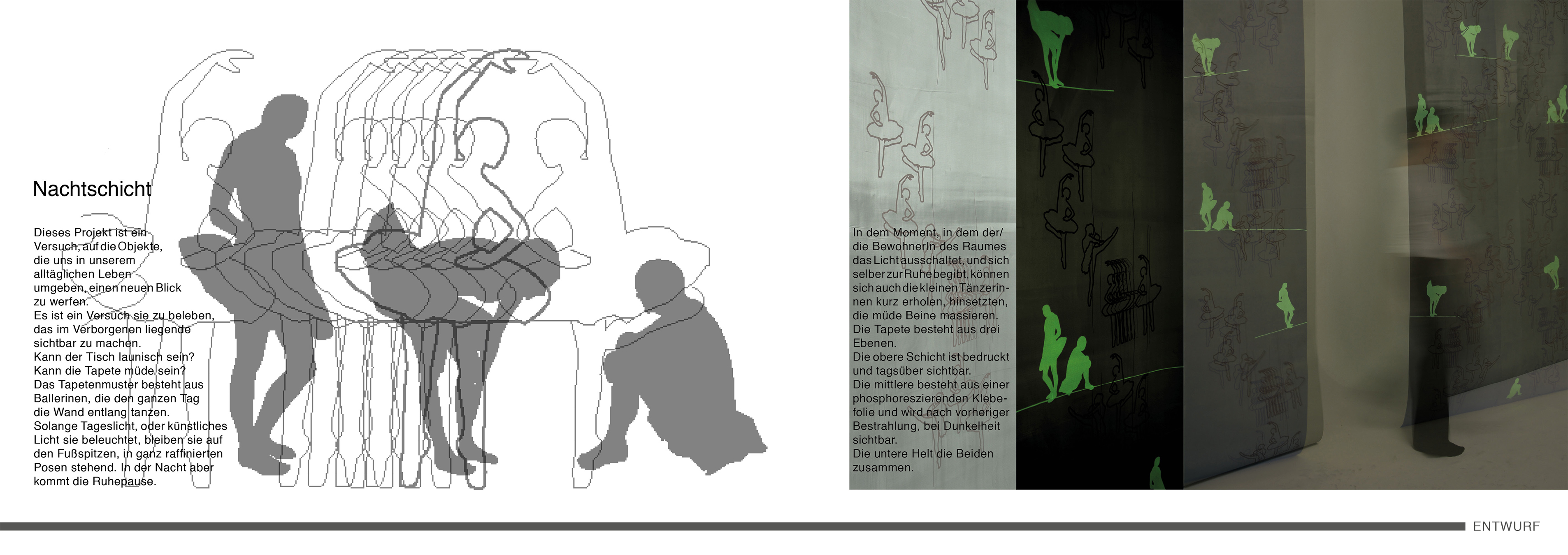 Kann die Tapete müde sein? Das Tapetenmuster besteht aus Ballerinen, die den ganzen Tag die Wand entlang tanzen. Solange Tageslicht, oder künstliches Licht sie beleuchtet, bleiben sie auf den Fußspitzen, in ganz raffinierten Posen stehend. In der Nacht aber kommt die Ruhepause. In dem Moment, in dem das Licht ausgeschaltet wird, können sich die kleinen Tänzerinnen erholen, hinsetzten, die müde Beine massieren.