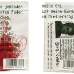 Eine Sammlung kleiner scheinbar wahllos zusammengestellter Objekte ist an eine Wand geheftet. Wie Fundstücke einer kriminologischen Spurensicherung sind diese Objekte eingetütete Erinnerungen, die vom Betrachter näher untersucht werden dürfen. Mit Hilfe eines Barcode-Scanners lassen sich die hinter den einzelnen Objekten verborgenen Erlebnisse und Situationen abrufen. Die Texte erscheinen wie langsam wachgerufene Erinnerungen, ähnlich einem Fernschreiber, Buchstabe für Buchstabe auf einem Bildschirm.
