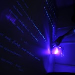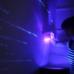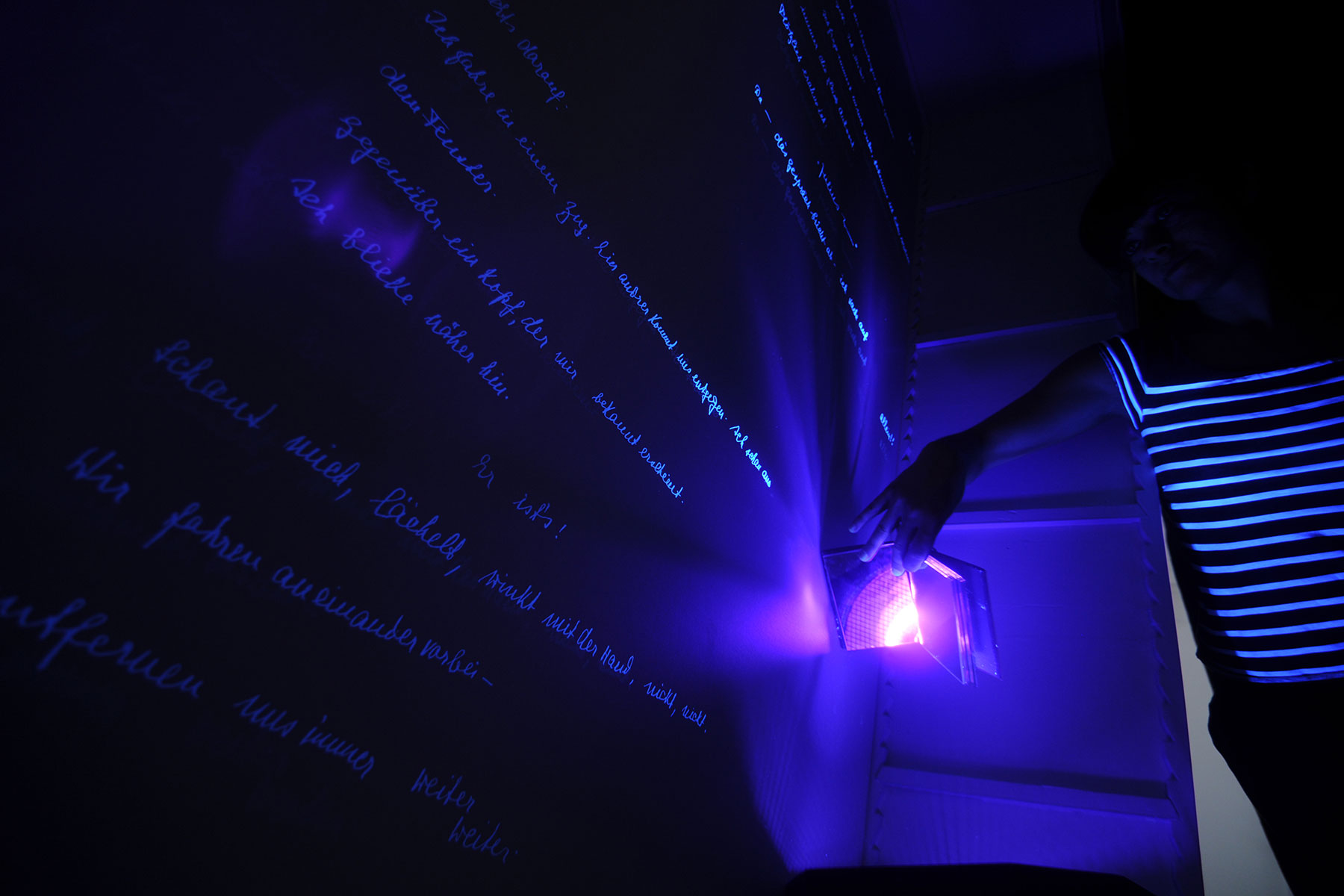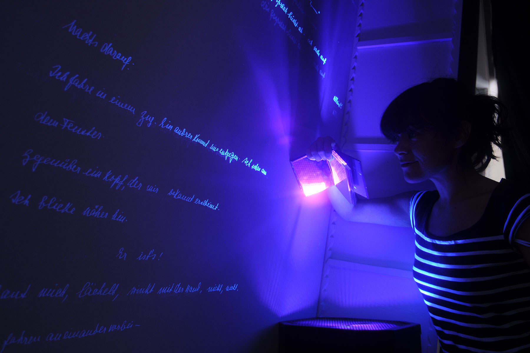Der Betrachter kann mit verspiegelten Buchseiten einen Lichtstrahl auf die im Verborgenen liegende Schrift lenken, wodurch diese Stück für Stück zu Tage tritt. Fragmente und Erinnerungen eines Lebens erscheinen, leuchten, flackern auf und verblassen wieder. Einzig die Gedanken des Betrachters bleiben zurück.