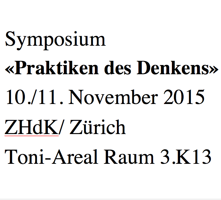 Durch welche Praktiken denken wir? Ausgehend von unterschiedlichen Konzepten des Denkens werden im Rahmen des Sym posiums «Praktiken des Denkens» verschiedene Konzepte des Denkens (Reflexion, Gedankenspiel, Begriffserfindung, Komposi tion, Bewegung etc.) und damit korrelierte Ausdrucksformen (akademische Textproduktion, Essayistik, Aphoristik, Konzeptkunst, Performance etc.) im Zusammenhang und entlang von Beispielen aus Philosophie, Kunst, Performing Arts, Musik und Literatur diskutiert. Dabei soll insbesondere auch das Verhältnis zwischen Denkpraxis und Theoriebildung zur Sprache kommen.