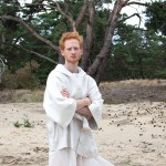 Kairos beschäftigt sich mit dem Rollkragenpullover, im besonderen mit dem Nonkonformismus, der ihm innewohnt. Zunächst getragen von Fischern der englischen Kanalinseln wird er in den 40er Jahren zum Erkennungsmerkmal der Existentialisten, der Bohème und der Avantgarde. Wichtige Momente sind der Bruch mit Konventionen und das Spontane, formelle Kleidung wird informell. Thema ist der Mann, der sich mit aller Konzentration einem Sachverhalt zuwendet, ihn beobachtet und reflektiert. Dieser Prozess schafft eine intensive Atmosphäre, das Warten auf etwas noch nicht Greifbares, eine Idee, eine Vision. Der Ausgangspunkt für die Silhouette ist der dreiteilige Herrenanzug mit Mantel. Großzügiges Volumen, Layering und grobe Wollqualitäten nehmen den Outfits das streng Formelle. ! Grob- und Feinstrick kontrastieren mit dichten Webstoffen. Der ‘sehr angezogene’ Look der Kollektion stellt Kopf und Hände in den Fokus – Denken und Handeln