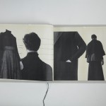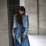 The Budapester is characterised by its special hole pattern (Lyra perforation) and the enormous quality. A shoe can be composed of up to 30 pattern pieces and each layer is assembled with highly precision. This explains the special quality of craftsmanship and the durability of up to 20 years. My grandfather inspired me to choose this men’s shoe – I’ve always looked up to him from when i was very little and admired his way of dressing and the importance he put on details for his outward appearance. That took me back in a time/generation (forties) where strict dress conventions determined the society. Wearing no vest with a suit was considerd a stylistic inconsistency. I was especially fascinated by the Gentlemen’s scene – a world that offers an amazing number of accessories and details and a way of life which is hard to find nowadays. The collection reflects the „being perfectly dressed“ and puts the focus on paying attention to every detail and to use each layer systematically. I used photographies of brogues by printing and drawing my designs upon them. This way I created my design concept. The question I asked myself was how can you set the processing and the quality of this shoe in a textile context? The starting point for the patterns was the three-piece suit and the man’s overcoat. Nevertheless, the silhouettes of the collection play with volume, and break out of the line of the classic boxy conventions. An important role is played by material and color contrasts, as well as the confrontation of the closed processing like the three-piece suit and the robust processing of Budapester.The processing of leather takes up the Lyra perforation of the shoe and can be found in details of the garments. Smooth goatskin and slightly textured wool are combined with flowing and transparent fabrics to create a clear contrast in the materiality.
