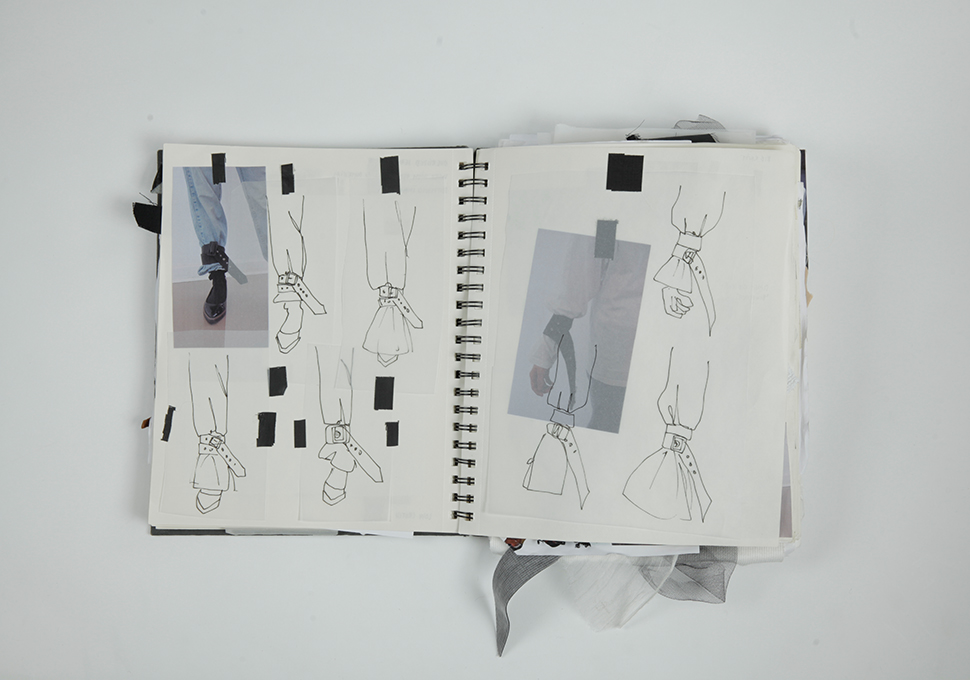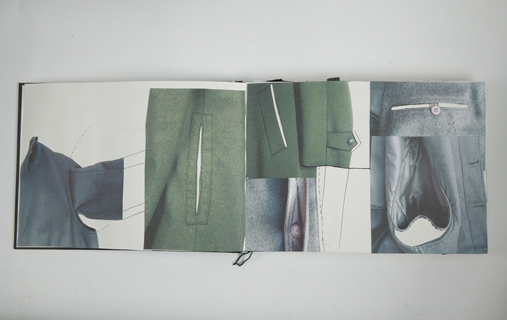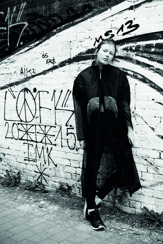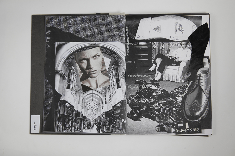 The Budapester is characterised by its special hole pattern (Lyra perforation) and the enormous quality. A shoe can be composed of up to 30 pattern pieces and each layer is assembled with highly precision. This explains the special quality of craftsmanship and the durability of up to 20 years. My grandfather inspired me to choose this men’s shoe – I’ve always looked up to him from when i was very little and admired his way of dressing and the importance he put on details for his outward appearance. That took me back in a time/generation (forties) where strict dress conventions determined the society. Wearing no vest with a suit was considerd a stylistic inconsistency. I was especially fascinated by the Gentlemen’s scene – a world that offers an amazing number of accessories and details and a way of life which is hard to find nowadays. The collection reflects the „being perfectly dressed“ and puts the focus on paying attention to every detail and to use each layer systematically. I used photographies of brogues by printing and drawing my designs upon them. This way I created my design concept. The question I asked myself was how can you set the processing and the quality of this shoe in a textile context? The starting point for the patterns was the three-piece suit and the man’s overcoat. Nevertheless, the silhouettes of the collection play with volume, and break out of the line of the classic boxy conventions. An important role is played by material and color contrasts, as well as the confrontation of the closed processing like the three-piece suit and the robust processing of Budapester.The processing of leather takes up the Lyra perforation of the shoe and can be found in details of the garments. Smooth goatskin and slightly textured wool are combined with flowing and transparent fabrics to create a clear contrast in the materiality.