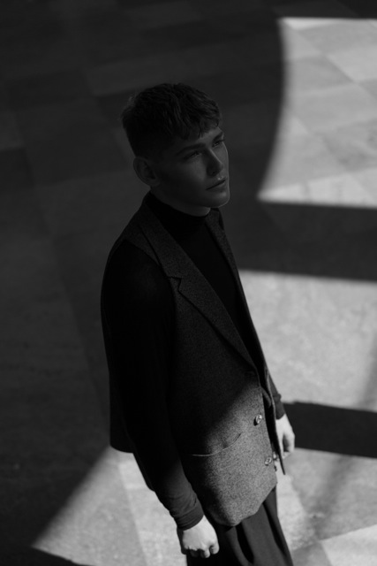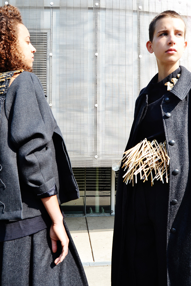 Kairos beschäftigt sich mit dem Rollkragenpullover, im besonderen mit dem Nonkonformismus, der ihm innewohnt. Zunächst getragen von Fischern der englischen Kanalinseln wird er in den 40er Jahren zum Erkennungsmerkmal der Existentialisten, der Bohème und der Avantgarde. Wichtige Momente sind der Bruch mit Konventionen und das Spontane, formelle Kleidung wird informell. Thema ist der Mann, der sich mit aller Konzentration einem Sachverhalt zuwendet, ihn beobachtet und reflektiert. Dieser Prozess schafft eine intensive Atmosphäre, das Warten auf etwas noch nicht Greifbares, eine Idee, eine Vision. Der Ausgangspunkt für die Silhouette ist der dreiteilige Herrenanzug mit Mantel. Großzügiges Volumen, Layering und grobe Wollqualitäten nehmen den Outfits das streng Formelle. ! Grob- und Feinstrick kontrastieren mit dichten Webstoffen. Der ‘sehr angezogene’ Look der Kollektion stellt Kopf und Hände in den Fokus – Denken und Handeln