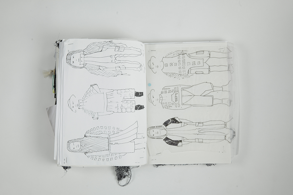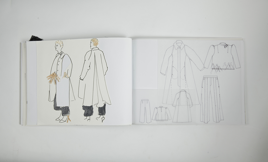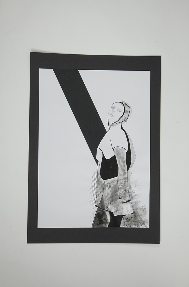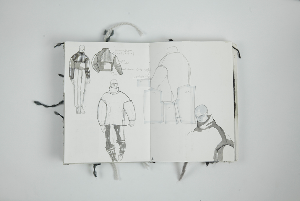The project „Remaster“ starts with the choice of a classic piece of clothing, which is important to me personal. I chose the „Hubertusmantel“ of my father, it is a special kind of coat, which is worn by many Austrian men on special occasions. The coat is formal and made out of loden. By reconstructing the piece of cloth I found out that it has a total different processing than normal coat constructions. The sleeves are finished with lining as a separate piece of clothing, as well as the corpus. The armhole has a open construction, because the coat has it’s origin in hunting clothes, the arm construction was created to guarantee mobility to shoot. I started to work with this mobility, by giving the wearer the possibility of moving. That fact was the starting point of my collection of two sewn outfits and drawn collection of 20 looks. Two important inspirations for „remaster“ are the photo box of my family with pictures of my working relatives on the farm and the research of this specific coat and sleeve construction. Important for my design was home, tradition, handicraft and generations. Most people leave home, but we all take values, moments and family backgrounds with us. This makes every person special. By showing my stock, I try to combine the feeling of where I come from with the fact that the world is open to me. With the use of a crafting technique with straw and a modern design I remastered my personal classic in my collection.