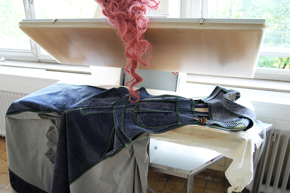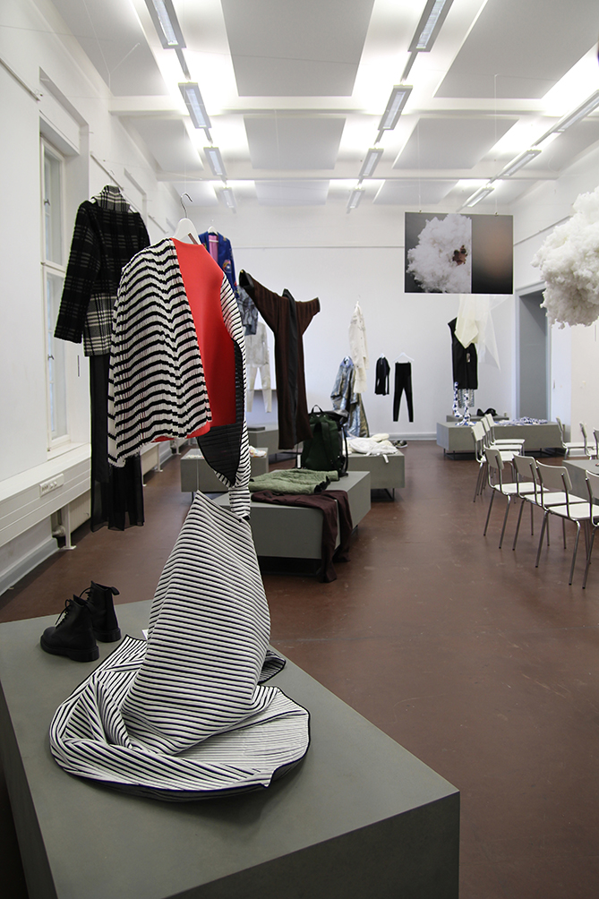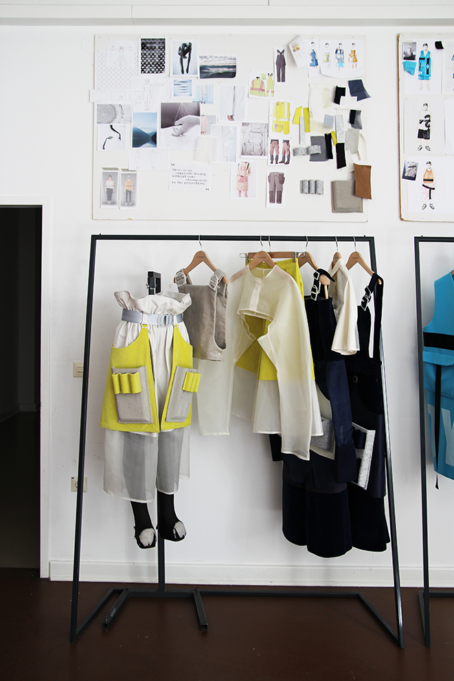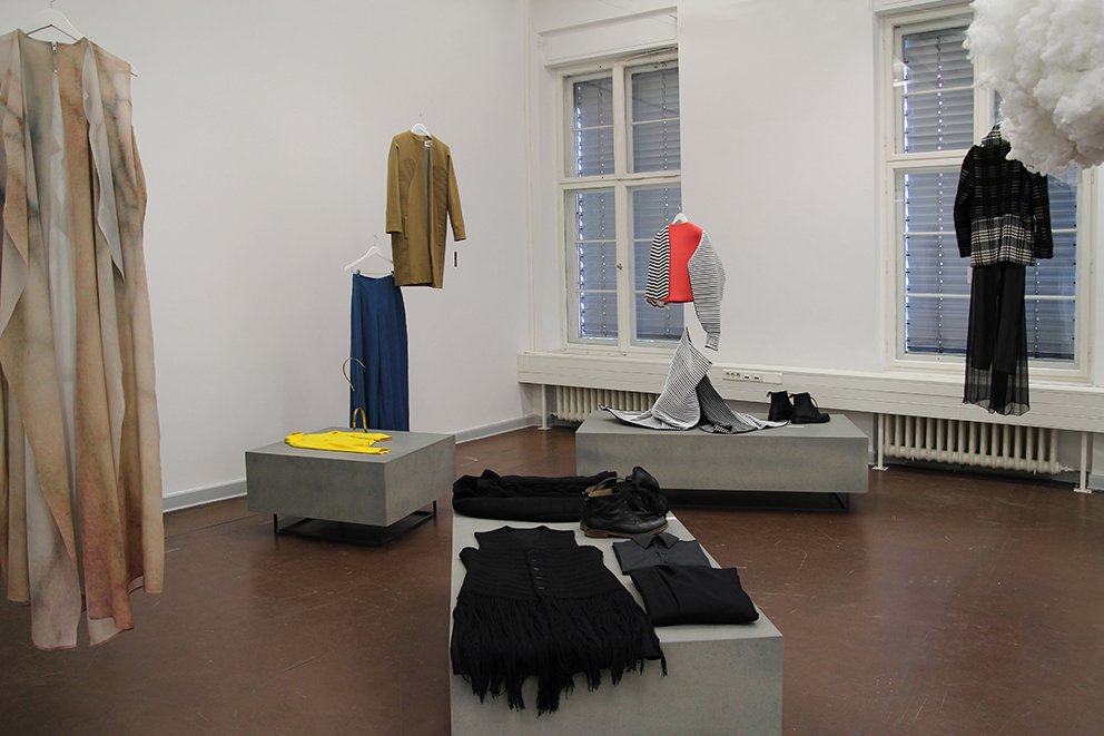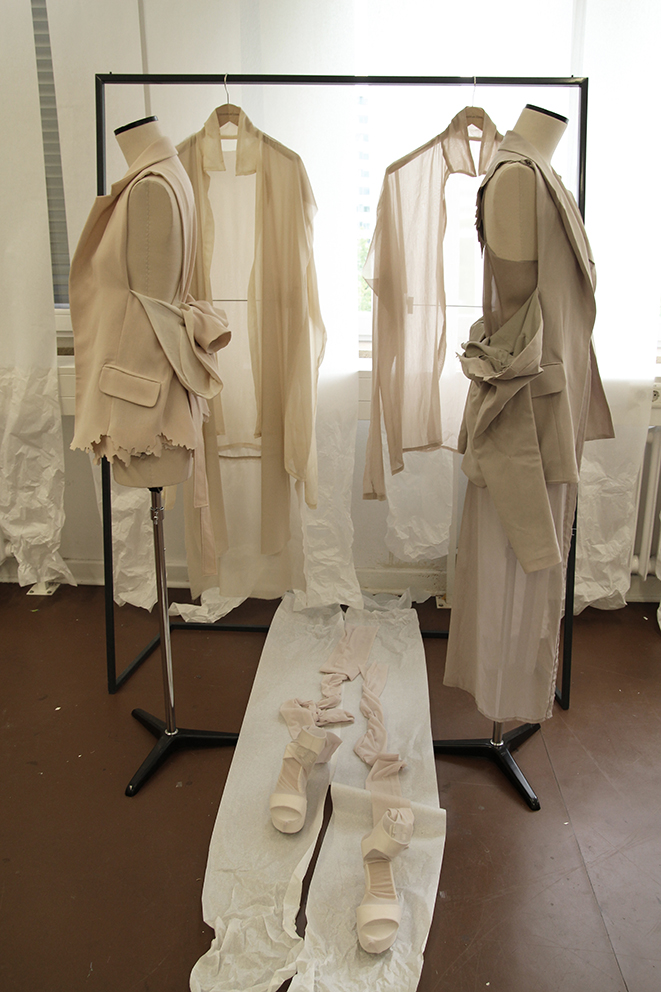 Dieser Ausstellungsraum ermöglichte den Zuschauern einen persönlichen Einblick in den Gestaltungsprozess der Modedesign-Studentin Hagar Rieger während einer Kollektionsentwicklung. Skizzen, Schnittkonstruktion + Papierschnitte, Probeteile, fertige Bekleidungsstücke und fotografische Ergebnisse boten Transparenz und machten die Arbeitsweise sowie thematische Hintergründe nachvollziehbar.