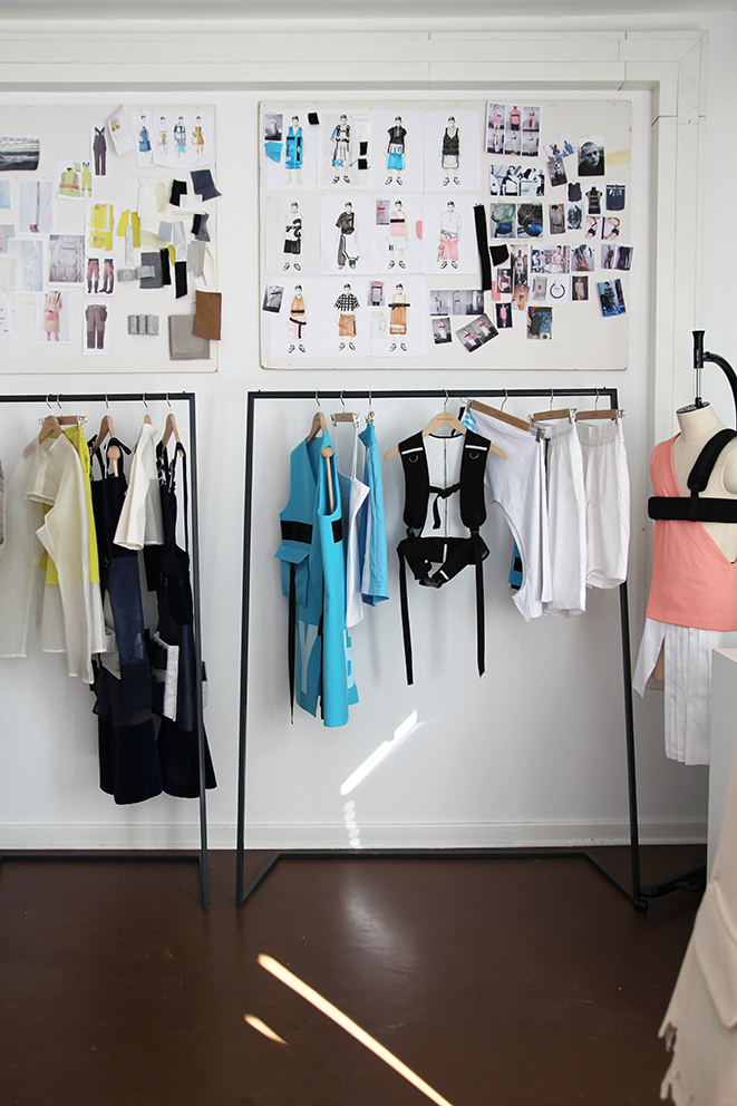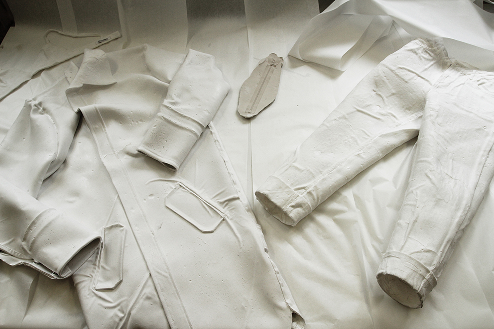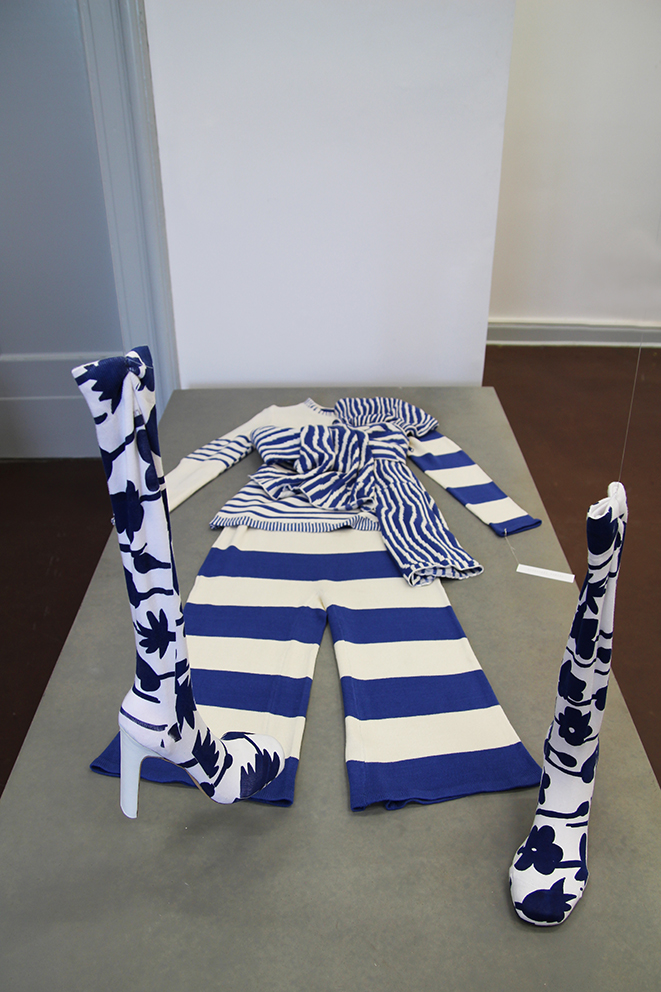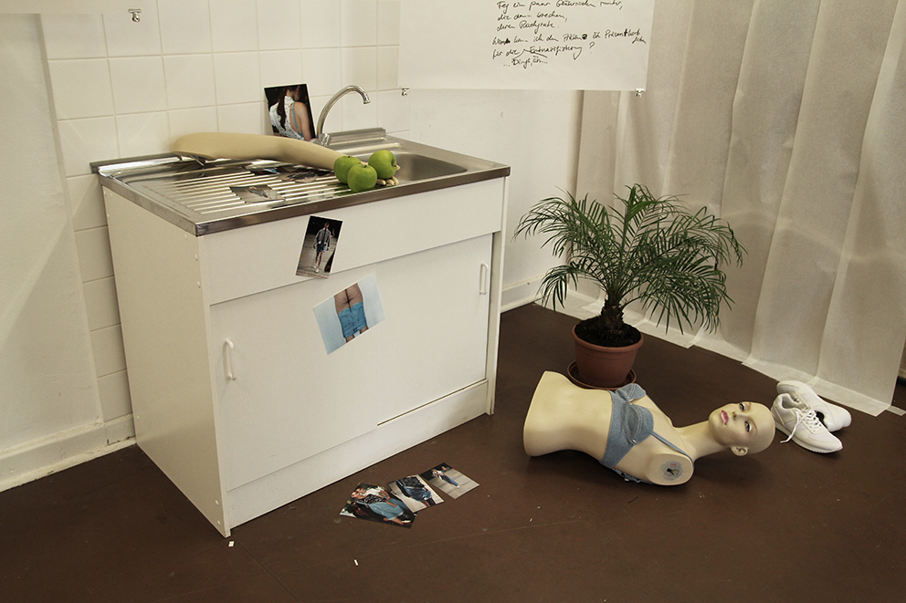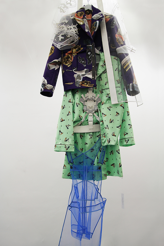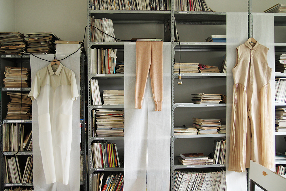 Dieser Ausstellungsraum ermöglichte den Zuschauern einen persönlichen Einblick in den Gestaltungsprozess der Modedesign-Studentin Hagar Rieger während einer Kollektionsentwicklung. Skizzen, Schnittkonstruktion + Papierschnitte, Probeteile, fertige Bekleidungsstücke und fotografische Ergebnisse boten Transparenz und machten die Arbeitsweise sowie thematische Hintergründe nachvollziehbar.