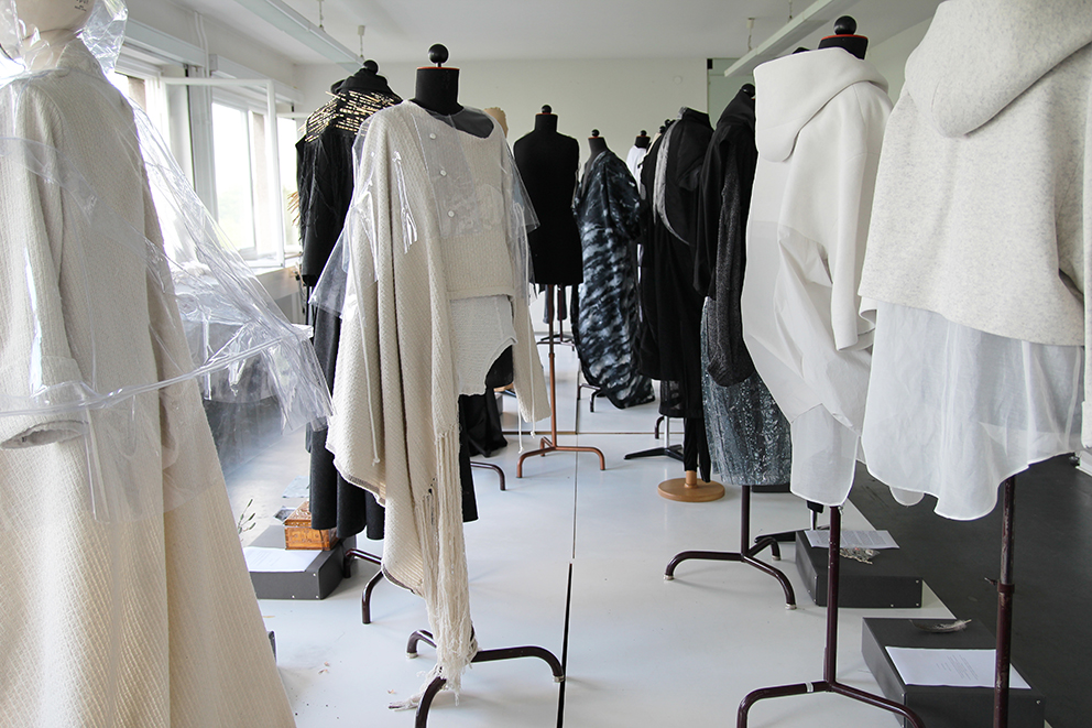 Das Projekt „Remaster“ des 4. Semesters zeigte sich im „work in progress“ – denn an einigen der von einem Klassiker inspirierten Kleidungsstücken wurde noch fleißig in der Nähwerkstatt gearbeitet.