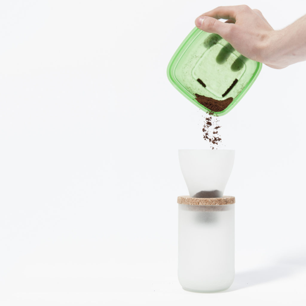 Cutting glass bottles can lead to fascinating new shapes. Using preshaped glass in Nairobi, found in the form of screw-top jars, glass bottles and light bulbs, this coffeemaker was made using a simple glass cutter and sandpaper.