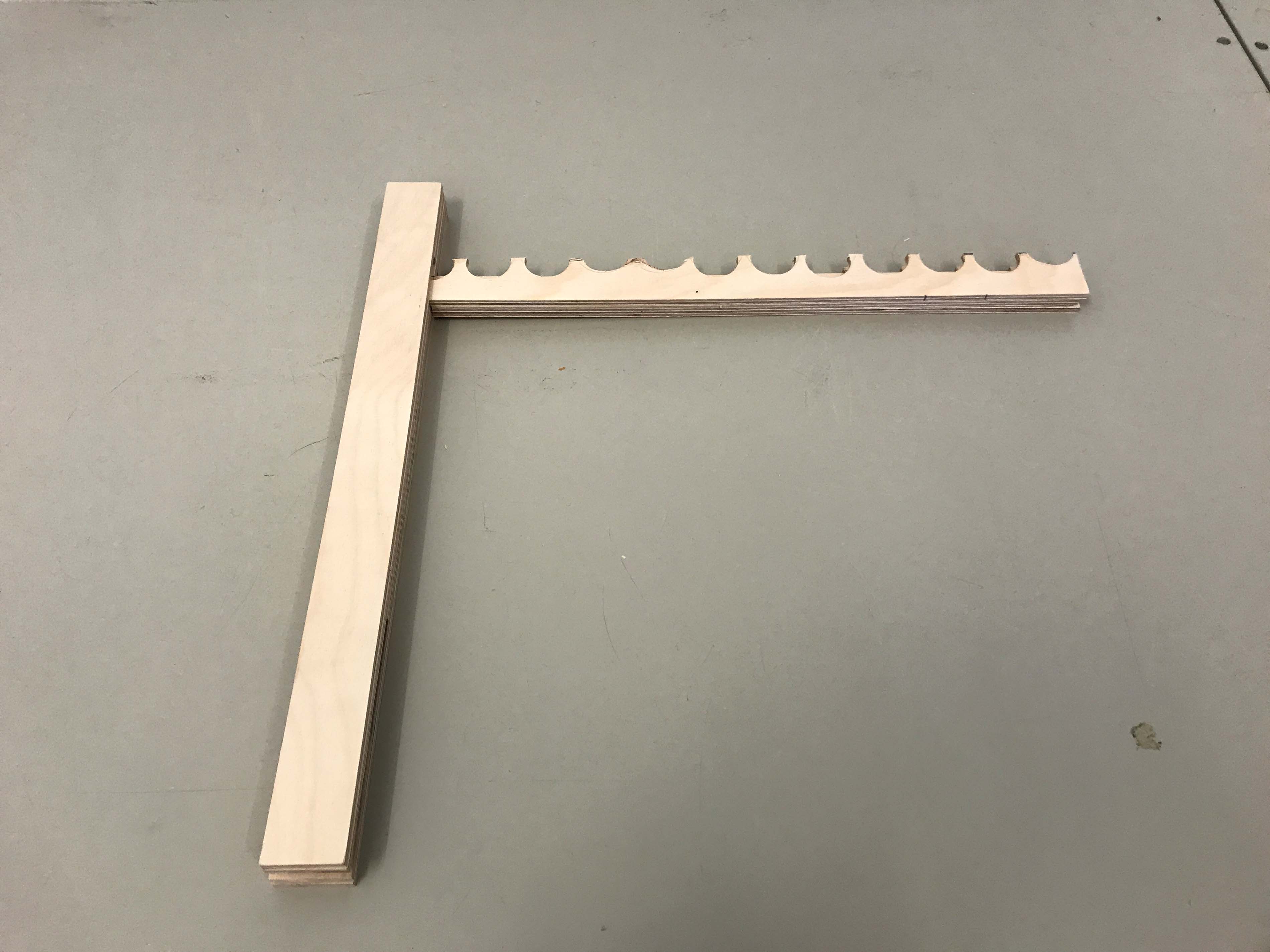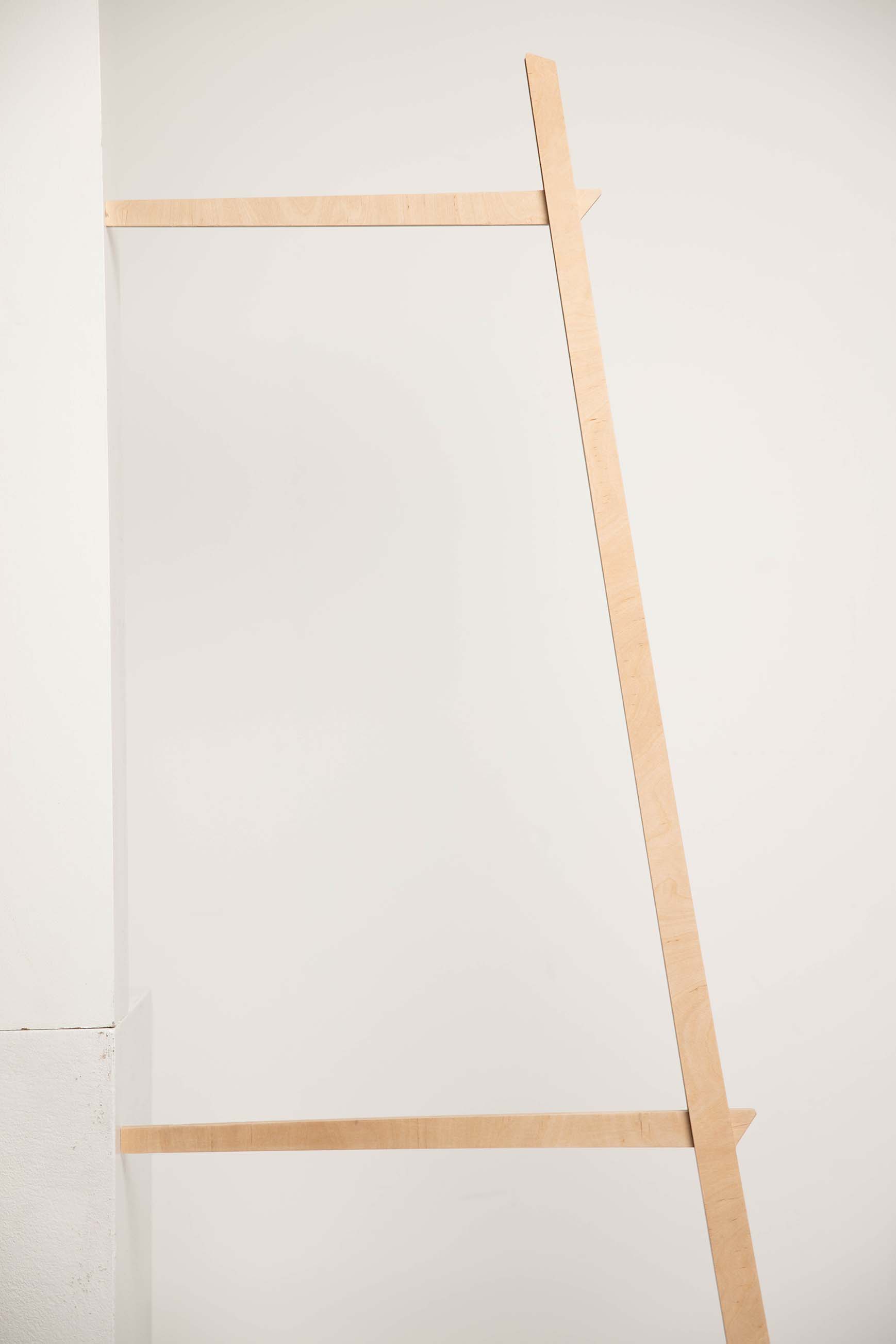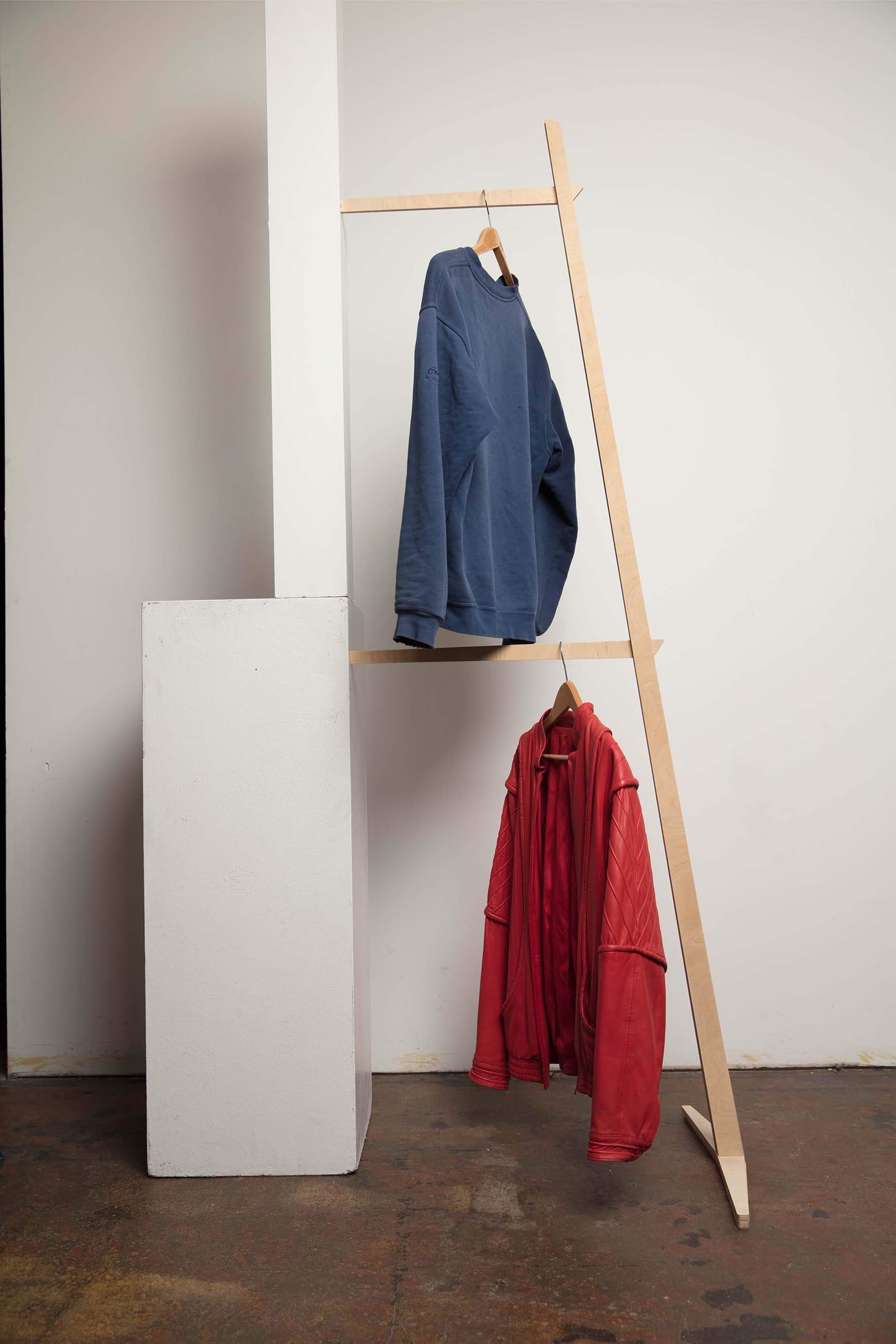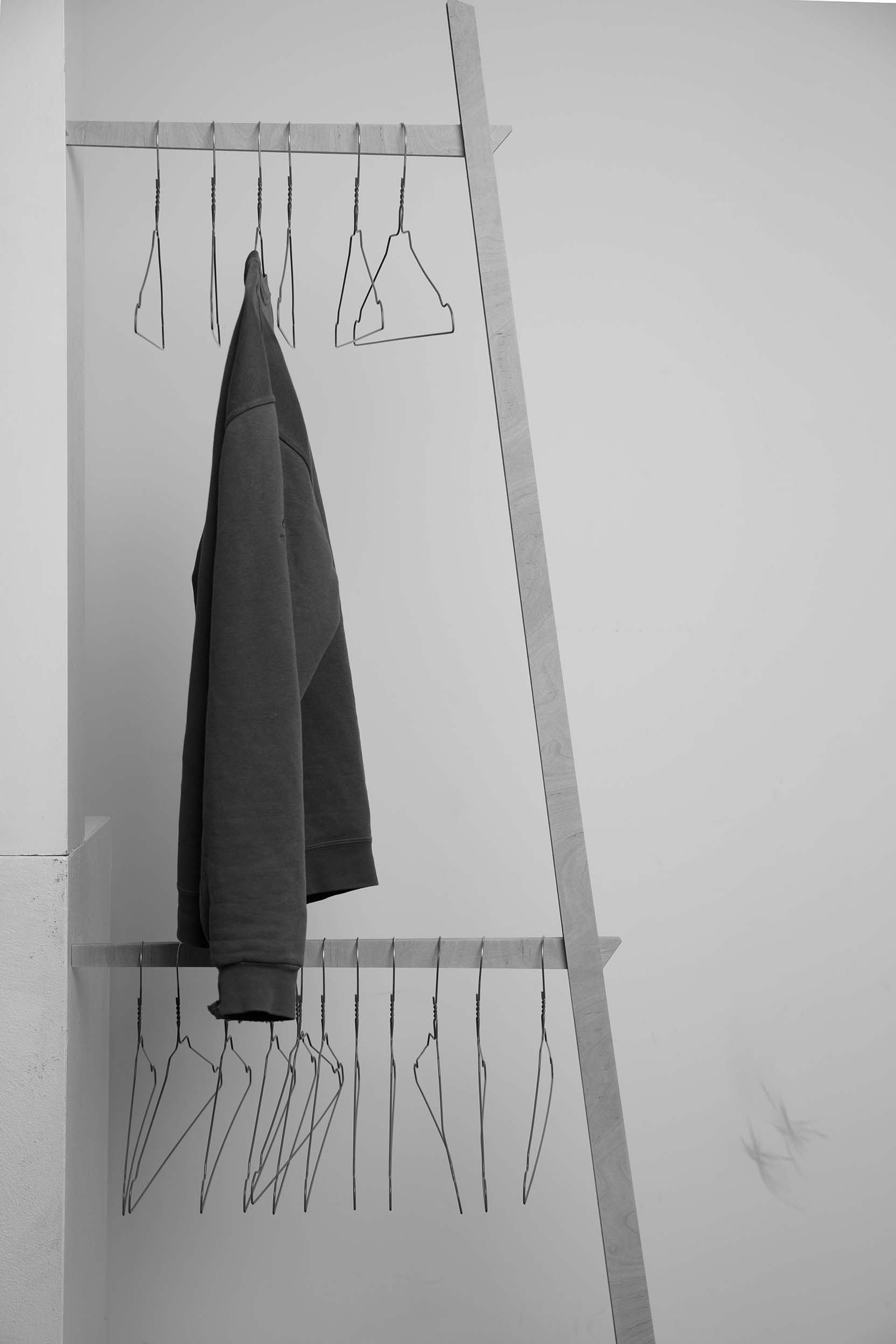 Das sich „abstützende“ Design ist gerade bei voller Auslastung besonders stabil. Durch die minimalistische Bauweise lassen sich fünf Garderoben aus einer handelsüblichen Multiplexplatte generieren. (sustainability & cost)