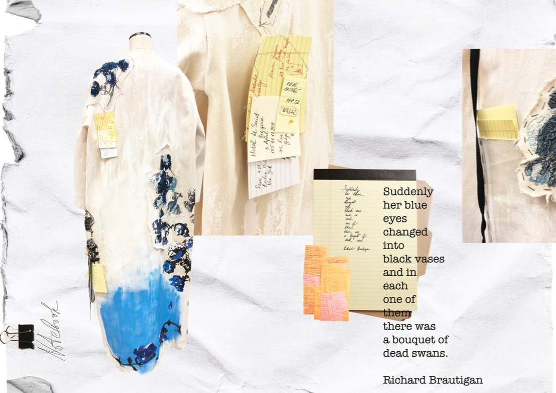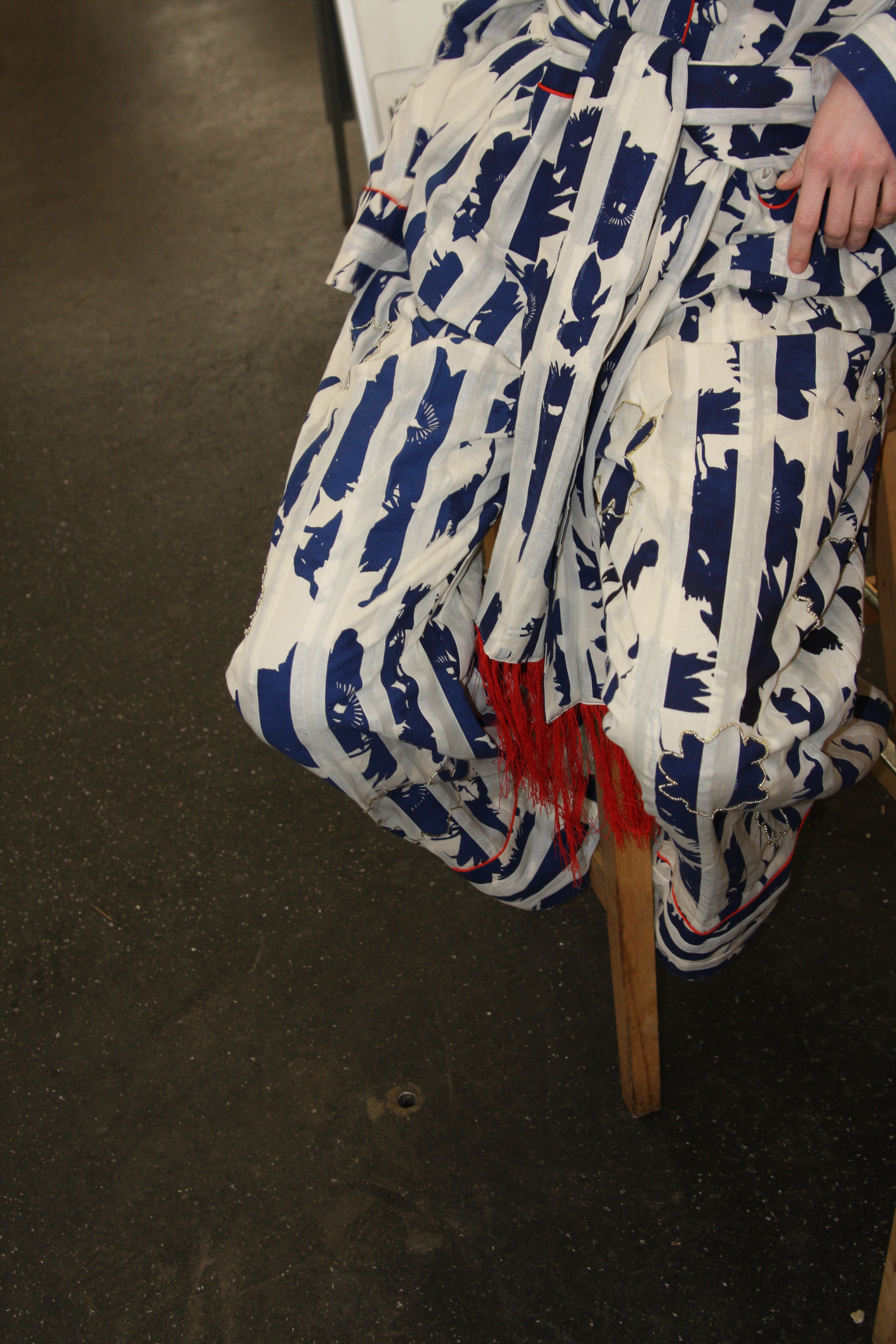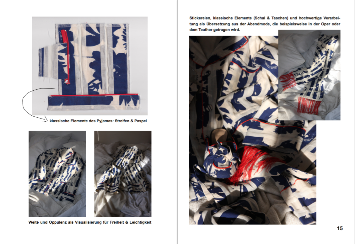 Nessel, in all seinen Qualitäten, wird das Rohmaterial darstellen, somit liegt ein starker Schwerpunkt in der Materialbearbeitung, denn der Stoff soll dem Entwurfskonzept entsprechend manipuliert werden. Eine große Rolle spielt hierbei die Printentwicklung mit Druckmotiven, die konkret realistisch zu idealisiert abstrakt interpretiert werden können. In Teamwork wird eine Druckvorlage als platzierter Print oder Rapport erstellt, die dann wieder individuell für die zu entstehende Silhouette genutzt wird, als kleines Emblem bis großflächig eingesetzt.