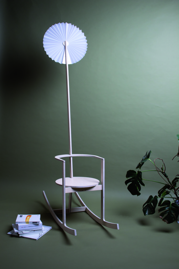 BRISE allows relaxation while circulating and purifying the air – a good synergy. By rocking the chair back and forth, it transforms kinetic energy into an analog ventilating system. With a fan attached high up, warm and purified air under the ceiling gets pushed down.