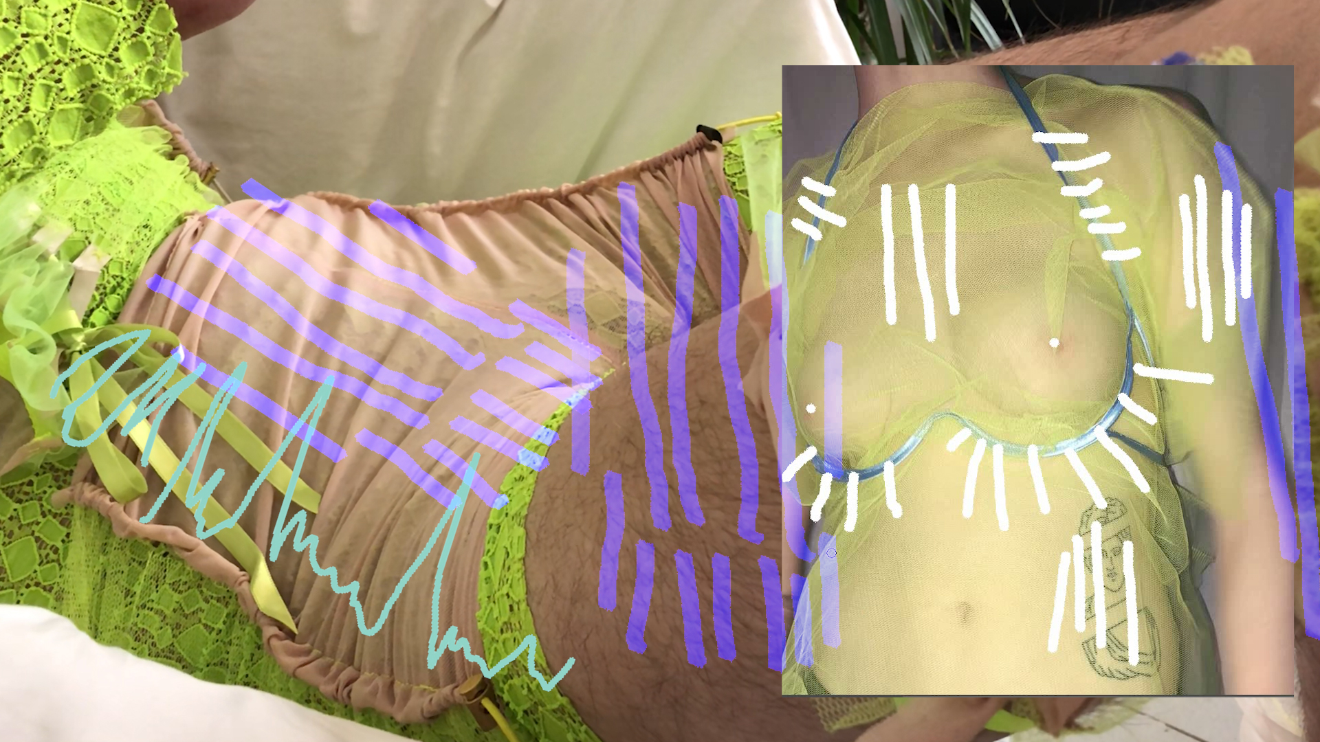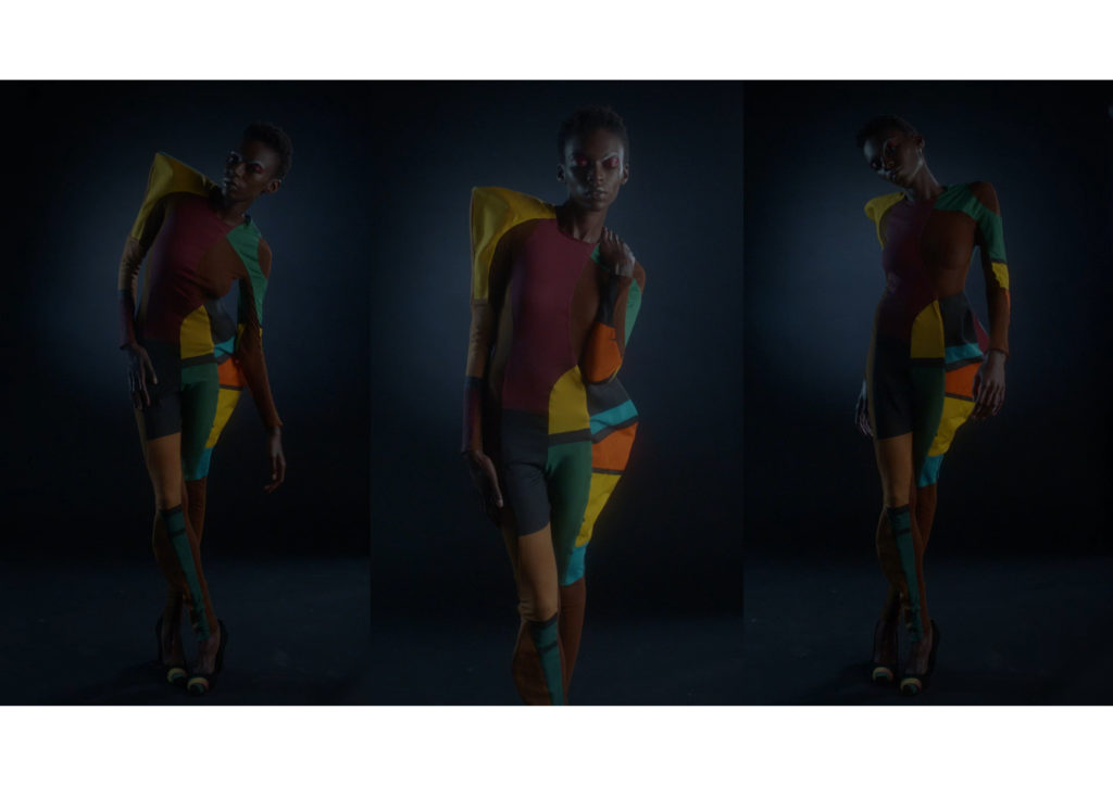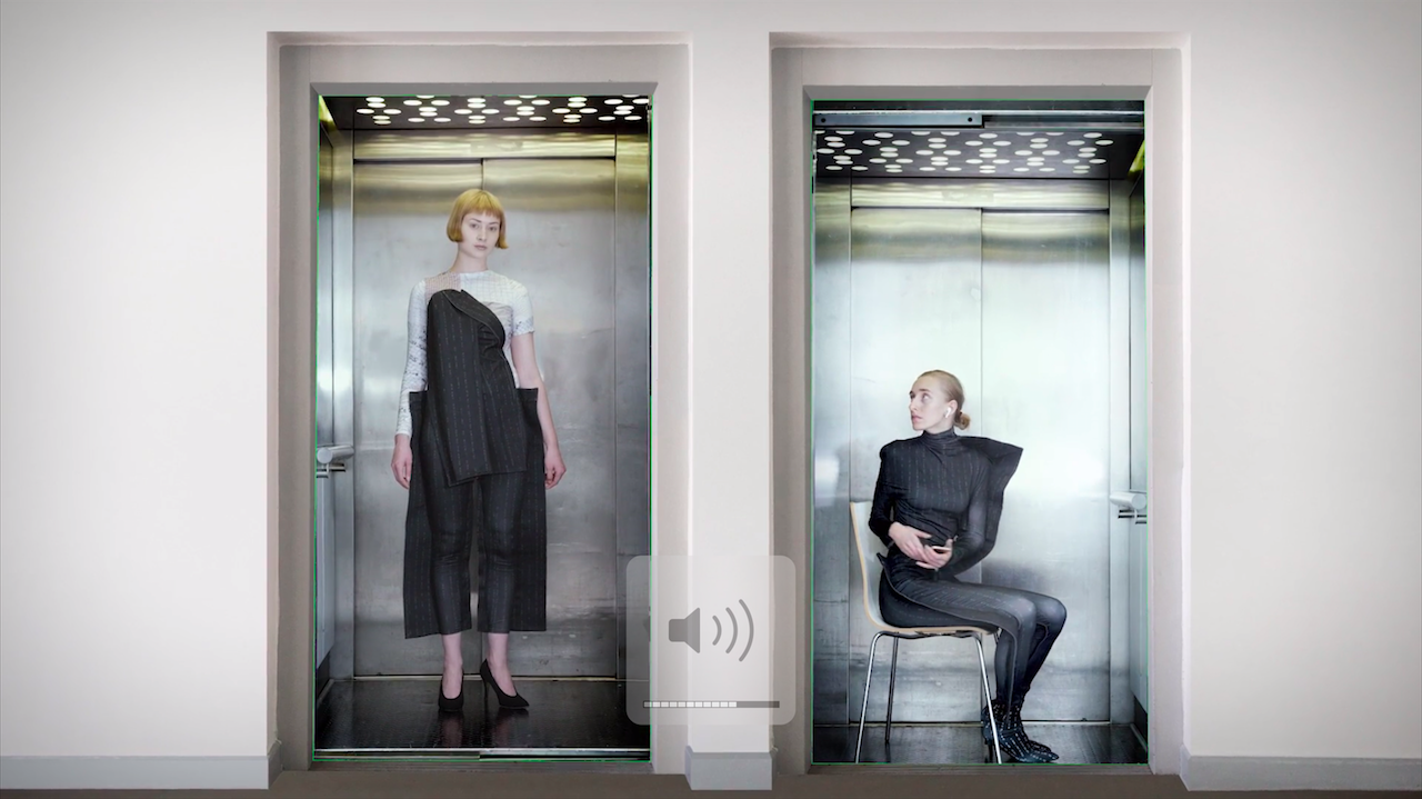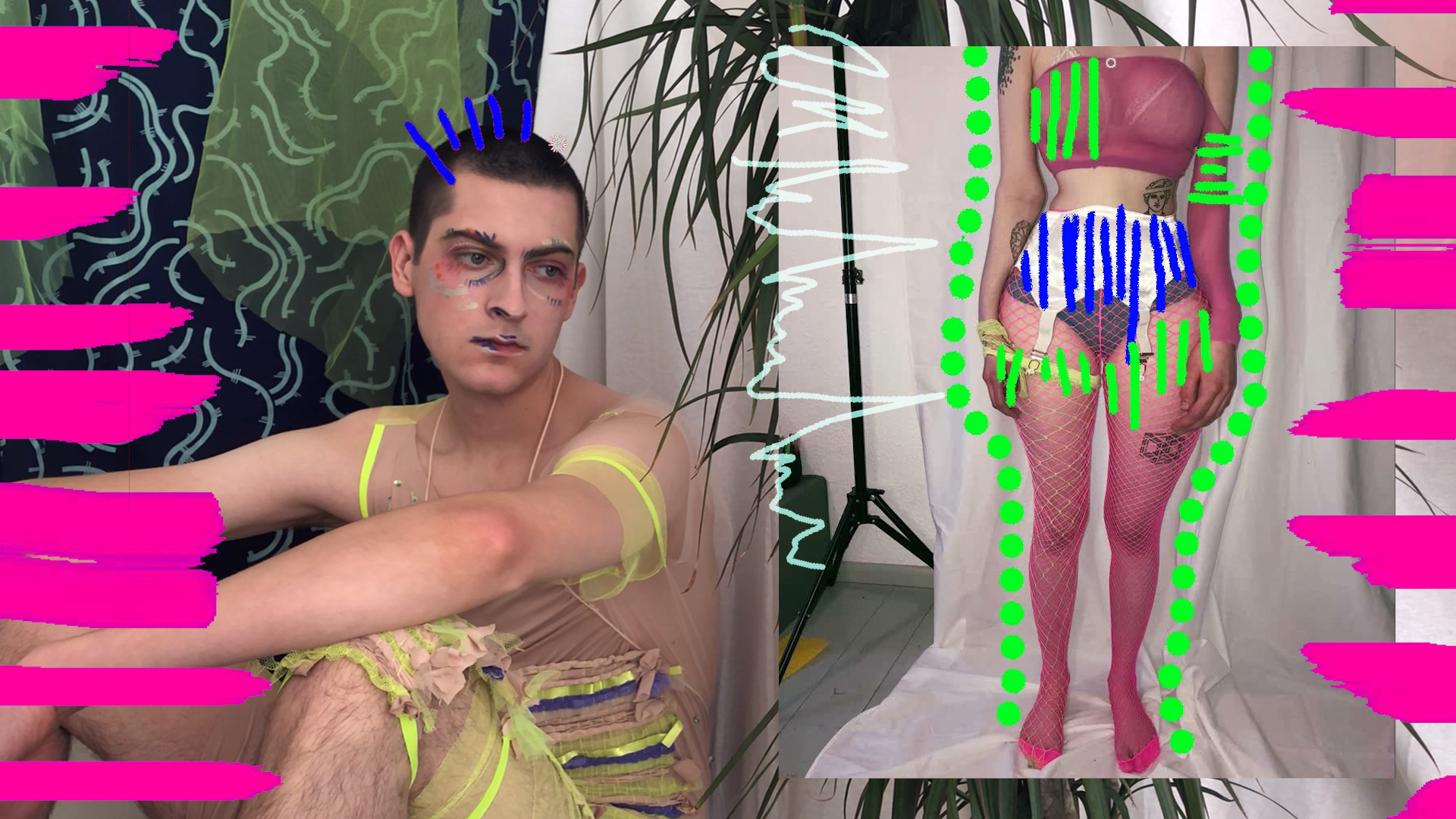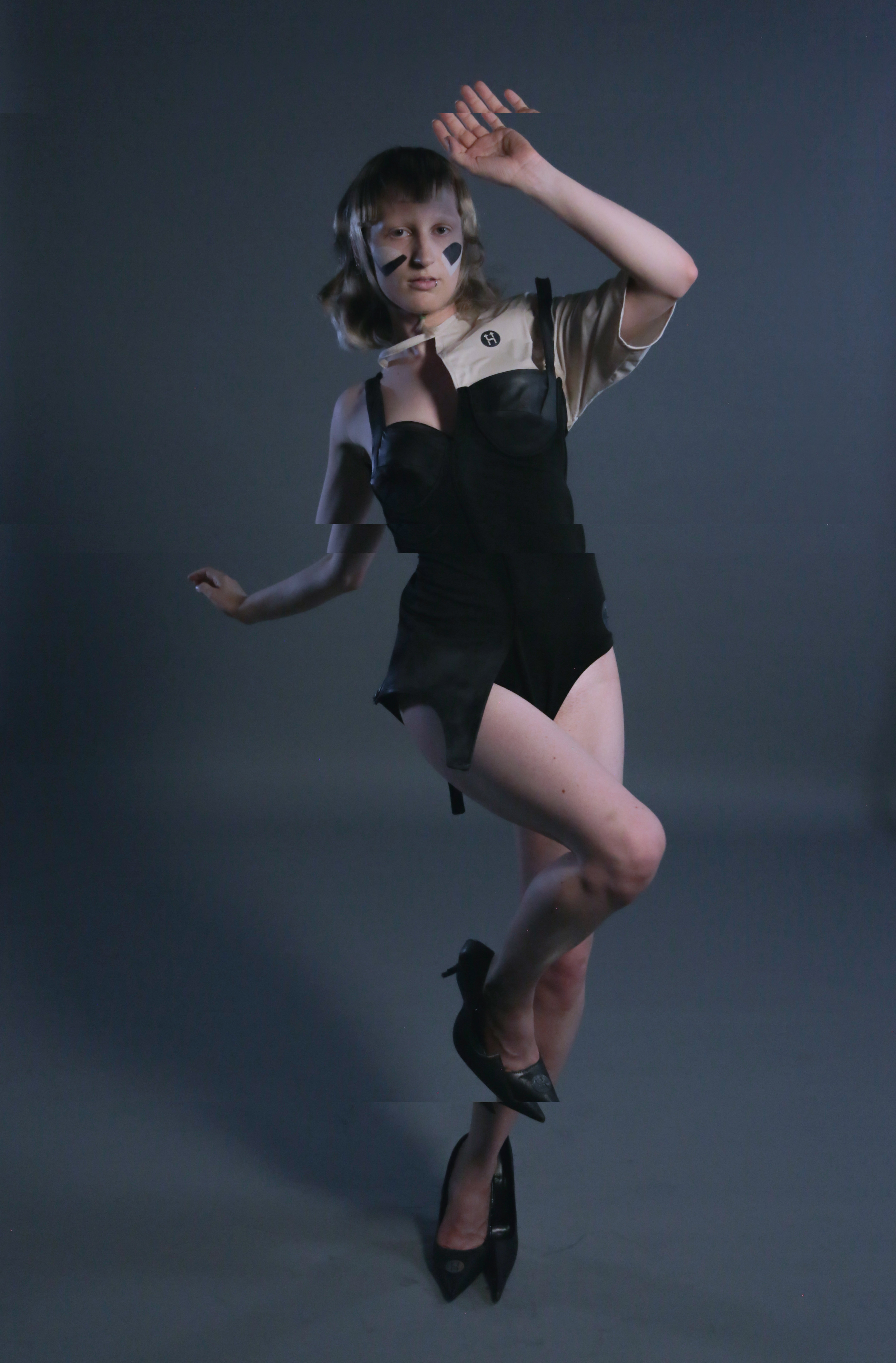 Algorithms, which are taking evermore design functions and are replacing the potentially irrational and subjective designer, are used and questioned in the design process. My designs were created by principles of randomness, by uncontrollability and mistakes. My silhouettes for example were created through mashing up and corroding Wolford advertising picture codes with quotations of Walter Benjamin and Vilém Flusser on photography.My designs are not only created by digital glitches but they are also bugging back in their presentation, creating mistakes. Makeup and styling aim to lower the facial recognition score. The model is now radically deindividualized; customers may aim for the same look.