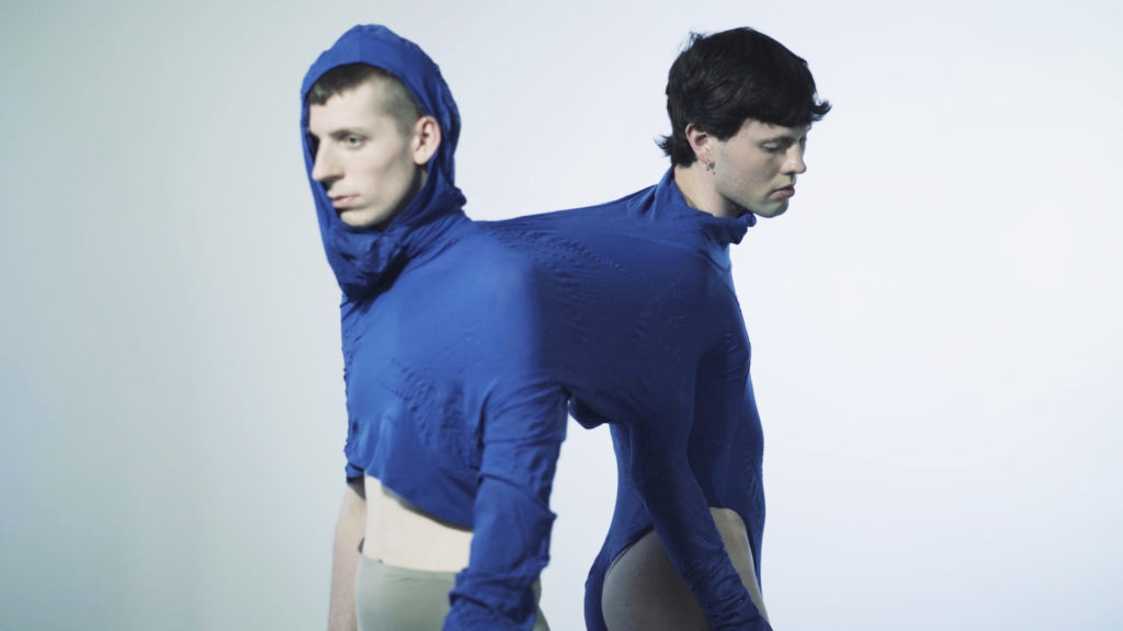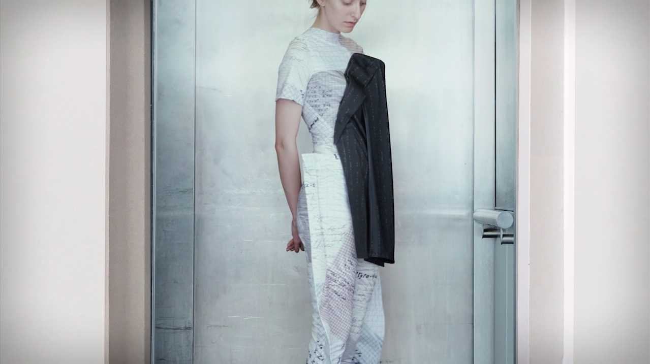 The collection includes underwear, bodies, tights and gloves, being fragmentary pieces that cover the body like a second skin. The layer overhead the lines shows the process of the programmed „object“ becoming a sculptural body. These pieces are made of plaster moldings that cast body pieces of a real person.