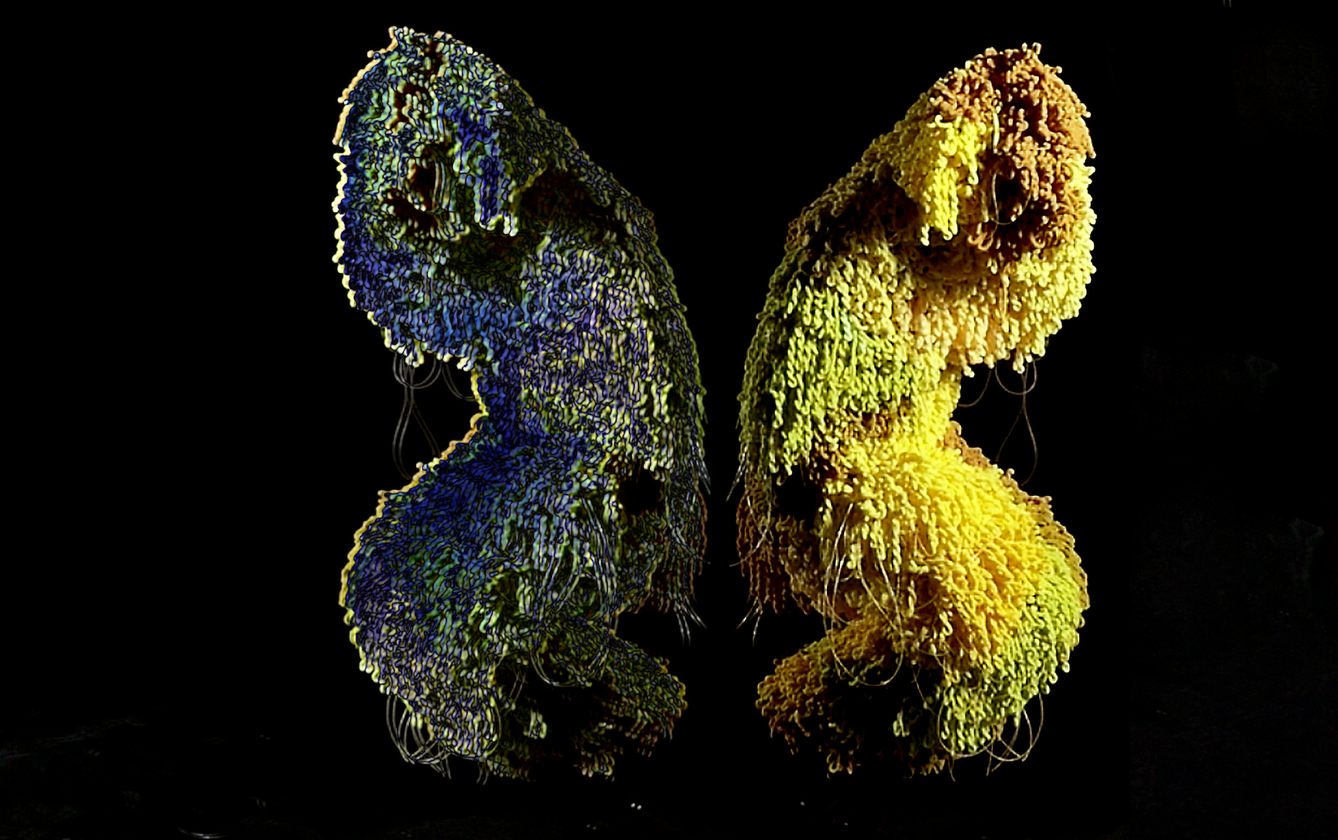 The chosen body is about to be created. In the video every piece appears on its own until the new body image is composed as a whole.