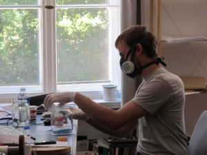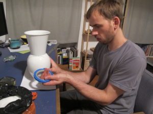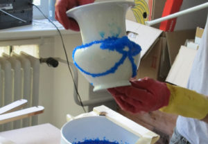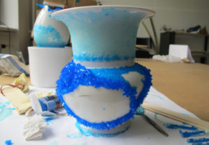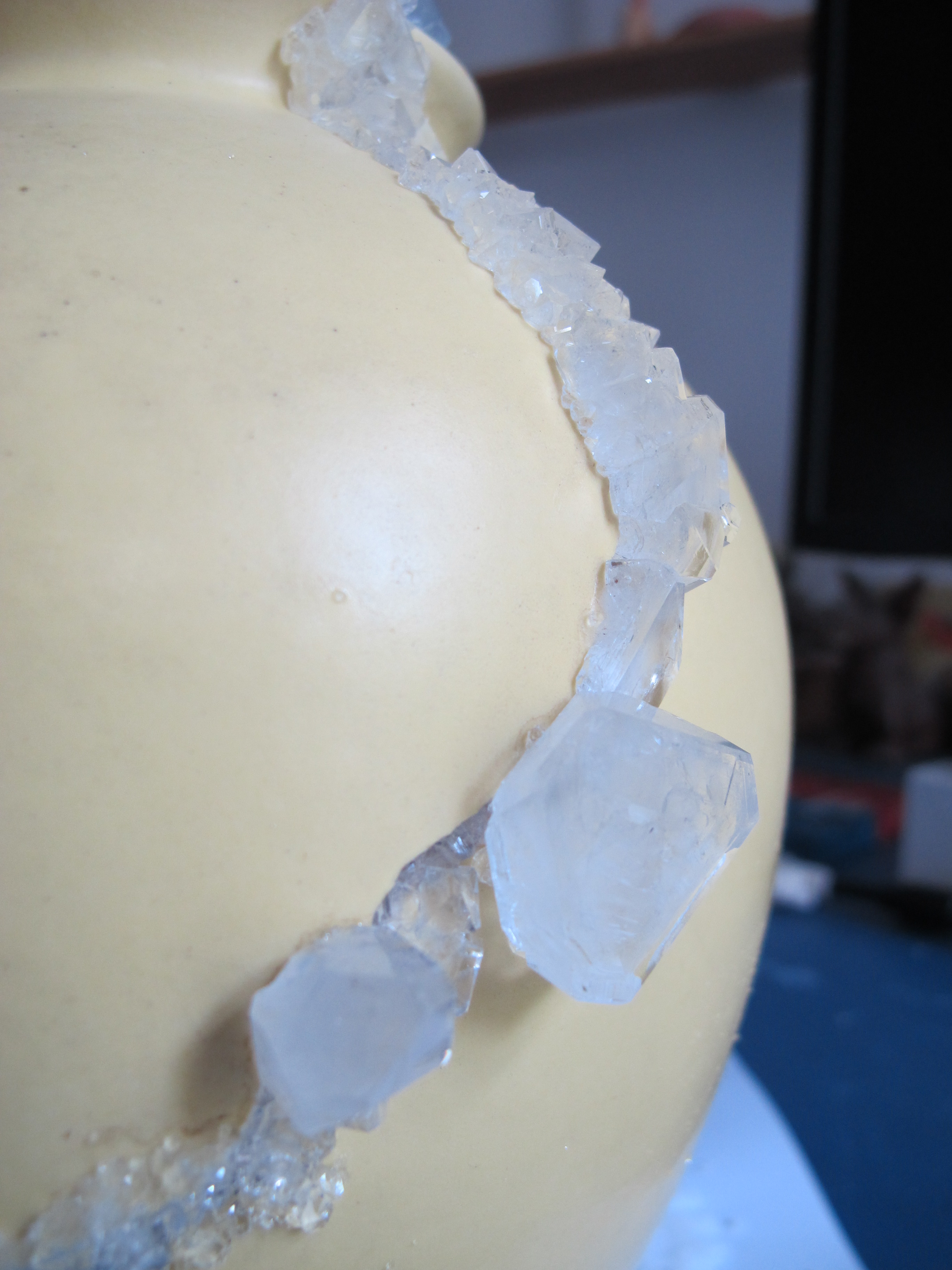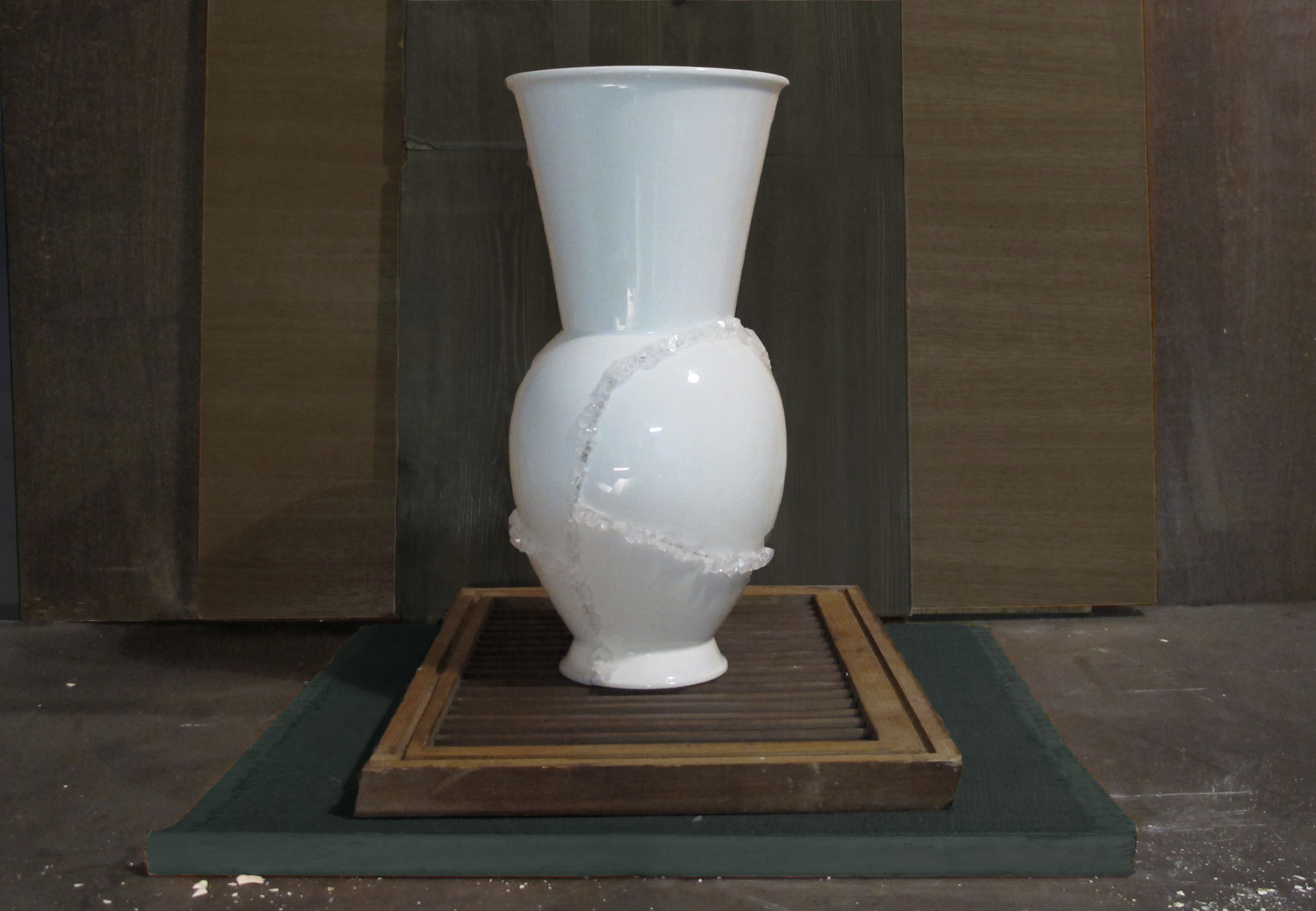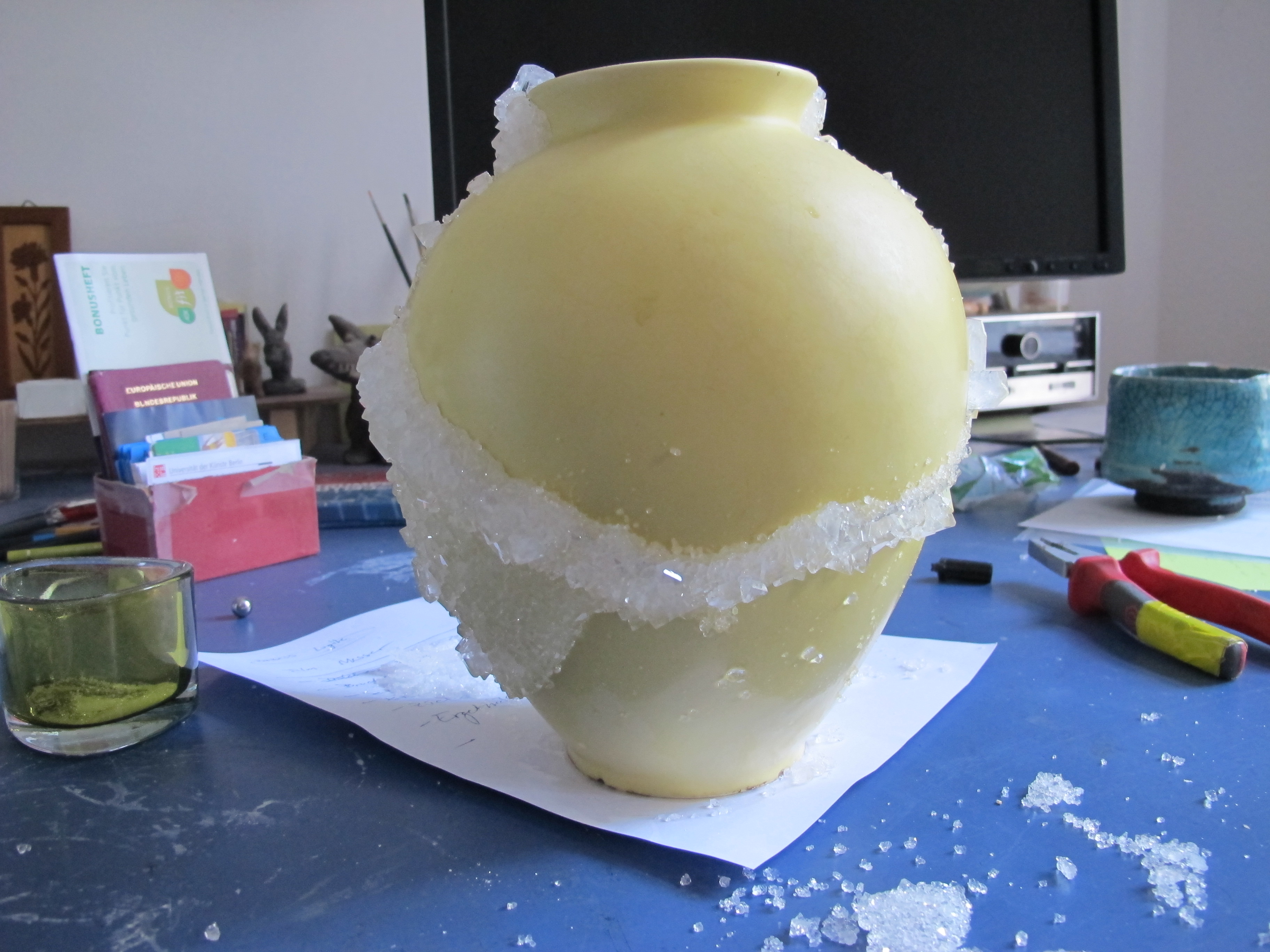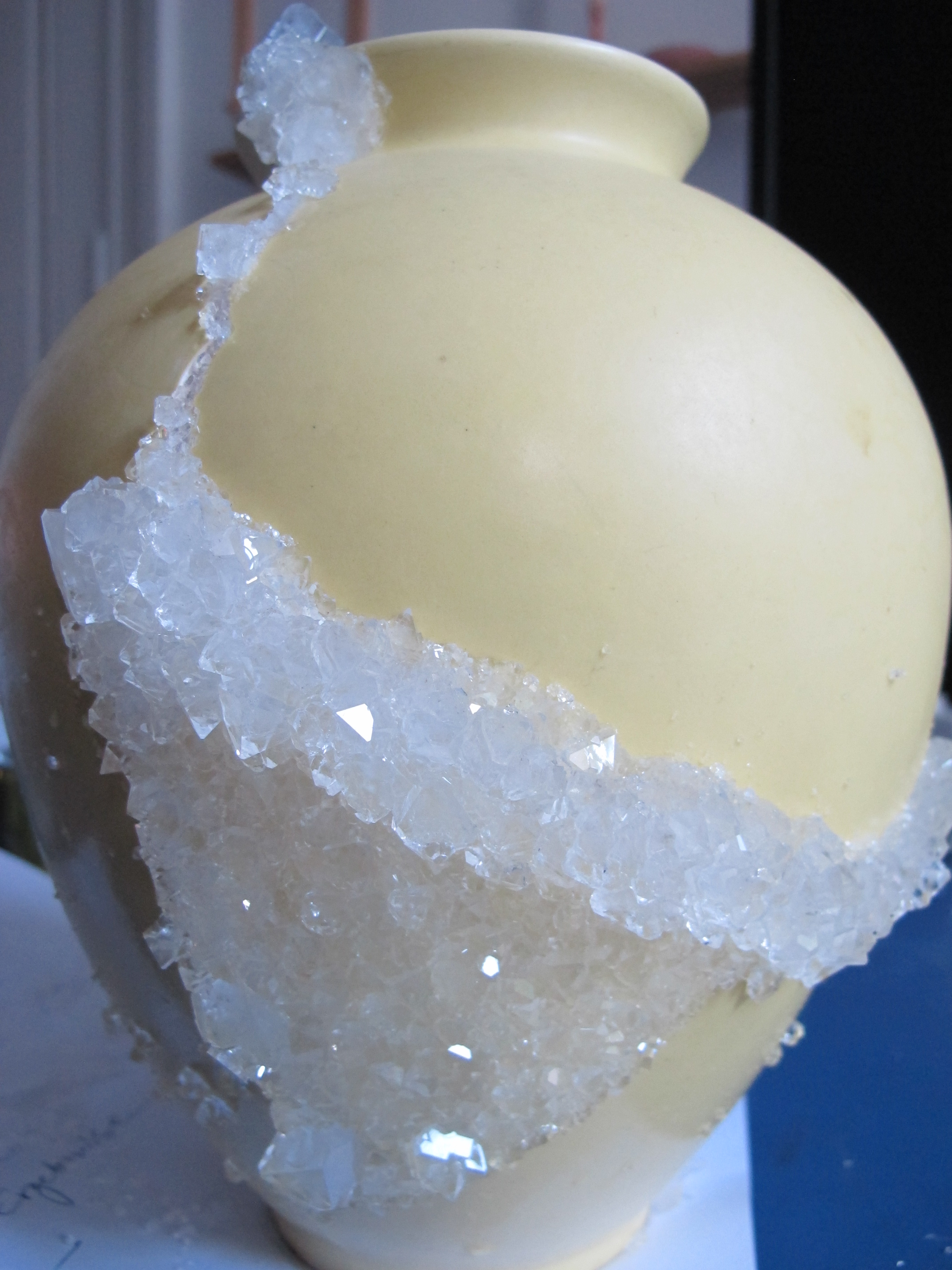 Die Natur lässt Brüche einfach zuwachsen oder überwuchern. Sie werden zu Narben, die bei der Betrachtung irritieren können, aber gleichzeitig auch gerade den besonderen Wert ausmachen, indem sie Einzigartigkeit verleihen und Geschichten ahnen lassen. Dieses Phänomen noch zu verstärken, habe ich mir zur Aufgabe gemacht. Ich möchte in meinem Projekt einen Mehrwert durch Zerstörung schaffen. Nach verschiedenen Reparaturexperimenten schienen mir hierfür Kristalle sehr geeignet. Man kann sie gezielt auf den rauhen Bruchflächen züchten, von wo aus sie sich dann vergrößern. Sie schließen Risse, wuchern über Fehlstellen hinweg und bilden sogar größere Volumen nach. Das so entstehende Objekt ist nicht mehr das, was es vor dem Bruch war, es nimmt das alte aber in sich auf und erweitert es zu einem neuen, einzigartigen Ding.