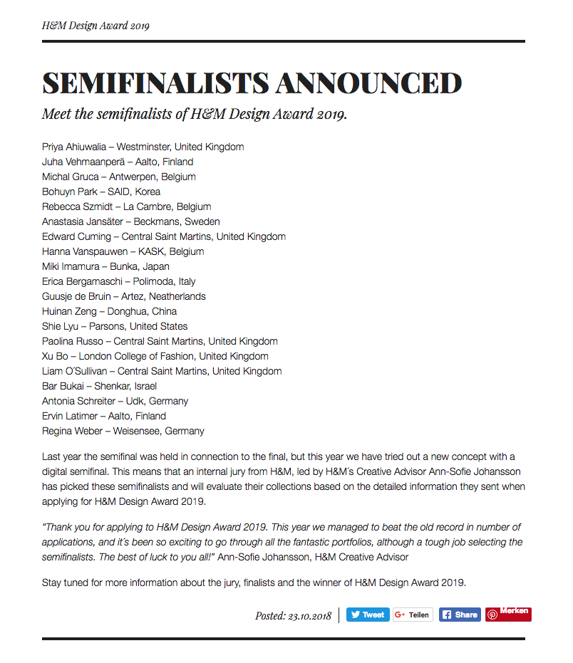 Mit Stolz dürfen wir verkünden dass sich UdK Absolventin Antonia Schreiter mit ihrer Bachelor-Kollektion ‚Die a happy man‘ für das Halbfinale des H&M Design Awards 2019 qualifiziert hat.