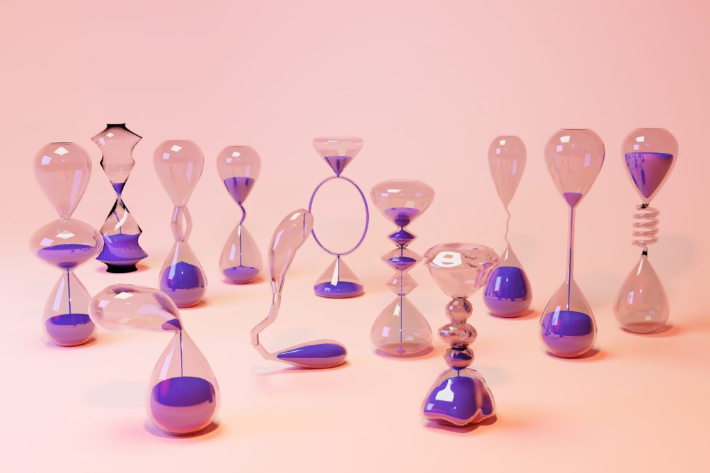 In einer Zeit, in der die Zeit rast werden hier Maßnahmen getroffen um diese einzufrieren. Die Zeit wird durch buchstäbliche Veränderung der Ausgangsform einer Sanduhr verlangsamt. Das Glas wird gestaucht, gestreckt, gebeugt und der blaue Sand gelangt so nur durch Umwegen, oder gar nicht in das zweite Glas. In dieser ironischen Versinnbildlichung spielen physikalische Gesetze keine Rolle.