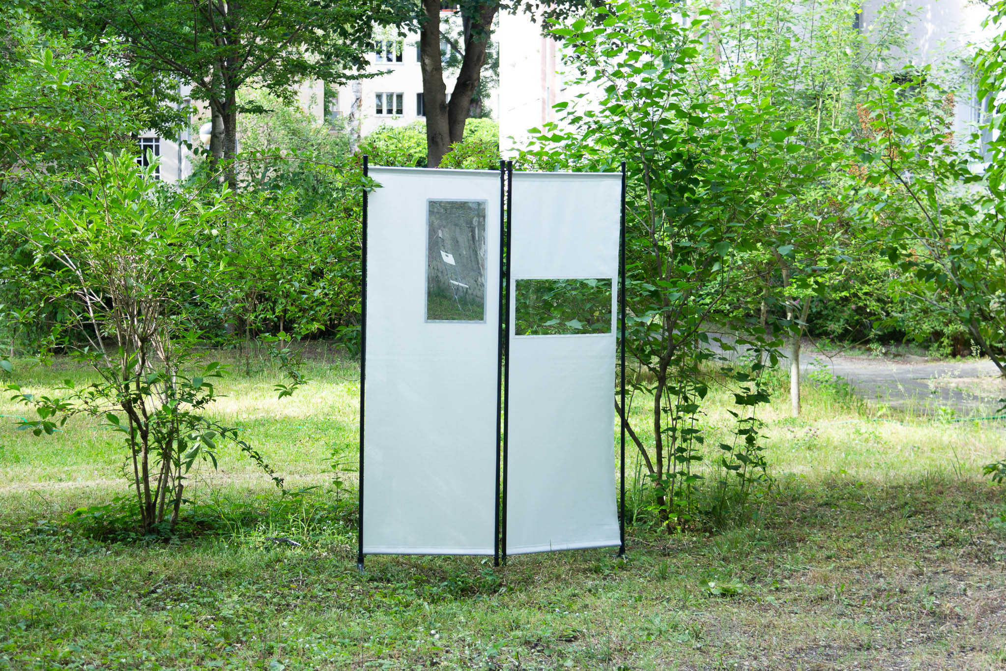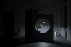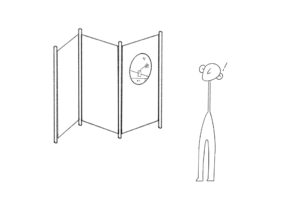 Wenn ein Spiegel auf dem Paravent verwendet wird, kann man die Innen- oder Außenlandschaft auf dem Paravent durch die Reflexion des Spiegels ausleihen. Wenn sich der Biegewinkel des Paravents und die Position ändern, ändert sich die Szenerie auf dem Paravent entsprechend. Um den Paravent dynamischer zu gestalten, wird Spionspielfolie verwendet. Wenn das Licht auf einer Seite des Paravents heller ist als auf der anderen Seite, sieht es eher aus wie ein Stück Glas aus der Dunkelseite und aus der hellen Seite wäre es wie ein Spiegel. Wenn die Helligkeit auf beiden Seiten gleich ist, kann man die Objekte hinter dem Paravent und die überlagerte Reflexion vom Spiegel sehen.