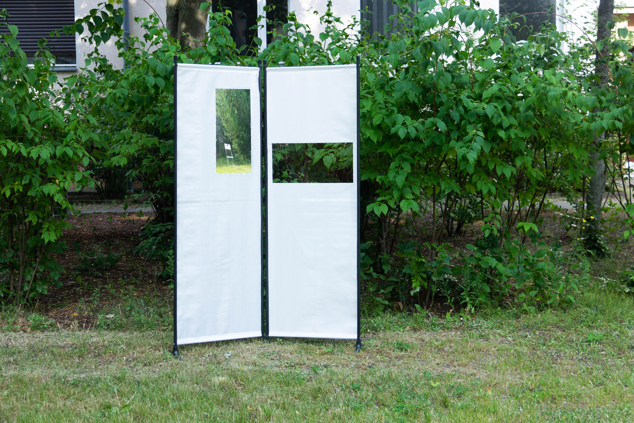 If a mirror is used on a folding screen, you can borrow the interior or exterior landscape on the folding screen by reflecting the mirror. If the folding angle of the screen and the position change, the scenery on the screen changes accordingly. In order to make the screen more dynamic, window insulation film will be used. If the light on one side of the screen is brighter than on the other side, it looks more like a piece of glass from the dark side and from the light side it would be like a mirror. If the brightness is the same on both sides, you can see the objects behind the screen and the superimposed reflection from the mirror.