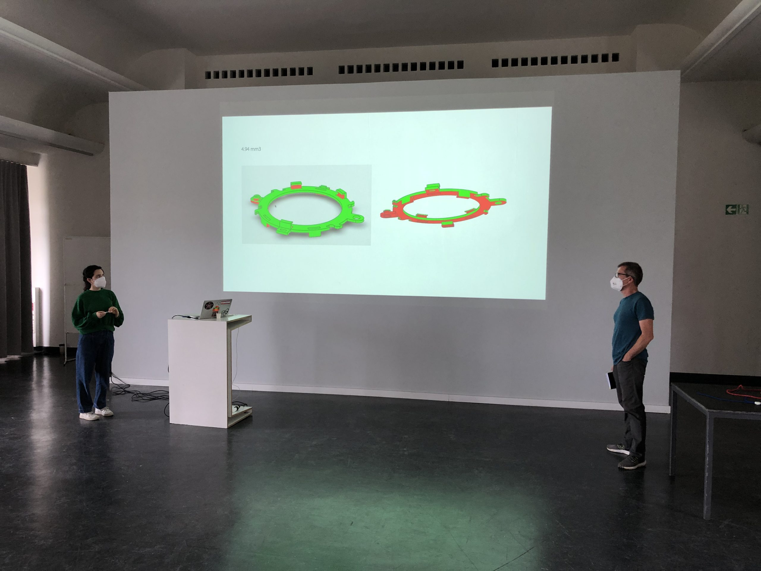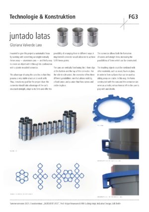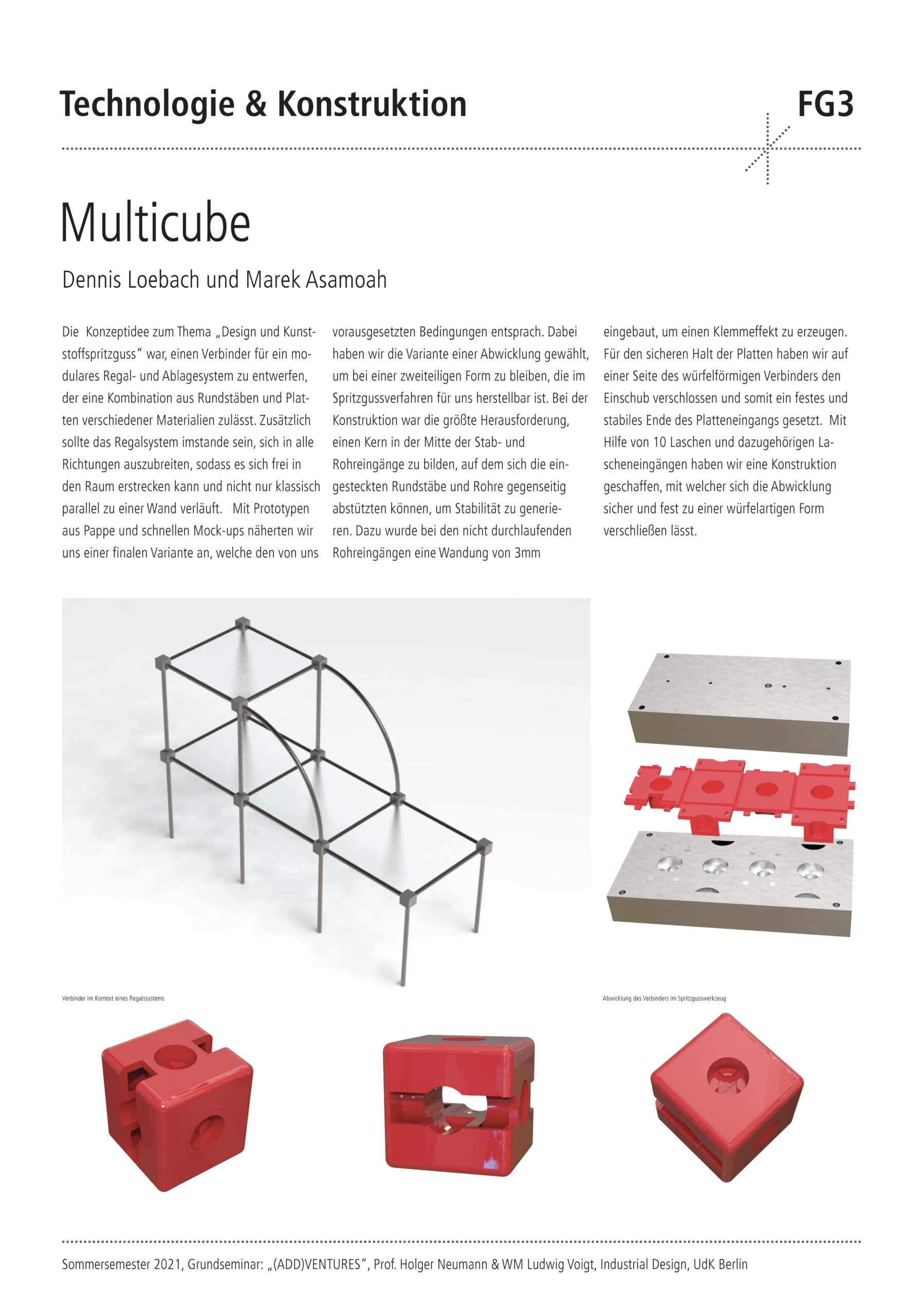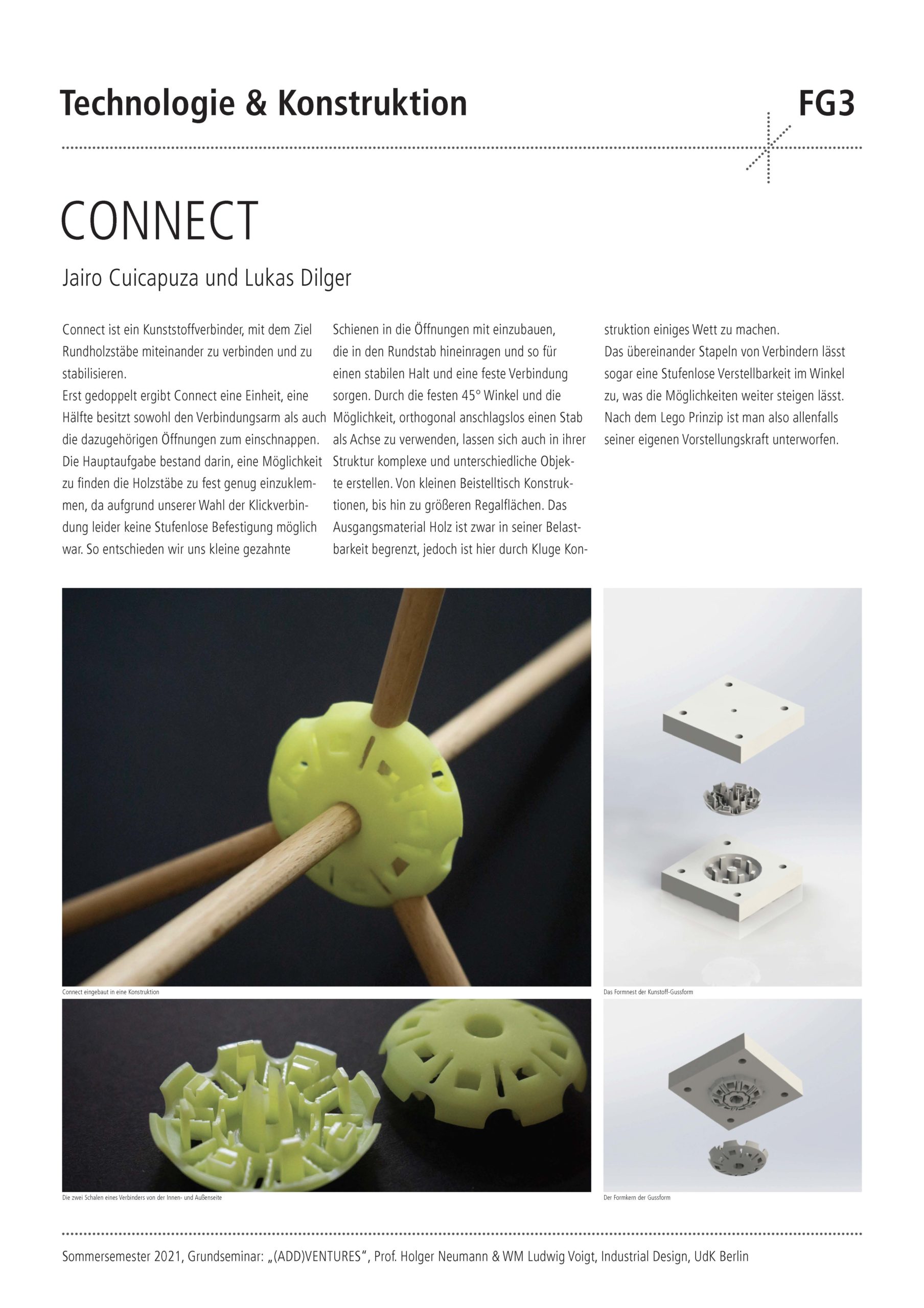 Die Semester-Aufgabe für die Studierenden war der Entwurf, die Konstruktion und der Prototypenbau eines Kunststoff-Verbinders. Dieser soll es mit sehr wenig Materialeinsatz ermöglichen, wandelbare und erweiterbare Objekte zu erschaffen. Der Verbinder dient als intelligenter Connector mit dessen Hilfe Halbzeuge wie Stäbe, Seile oder Platten zu interessanten und neuartigen Objekten kombiniert werden können. Wesentlicher Bestandteil des Design-Technologie Seminars war zudem die umfangreiche Aneignung theoretischen Wissens über Kunststoffe und die Herstellungstechnik „Kunststoffspritzguss“. Spezielle Software-Module wurden erlernt und dazu genutzt, die Simulation eines 2-teiligen Spritzgusswerkzeugs zu erstellen.
