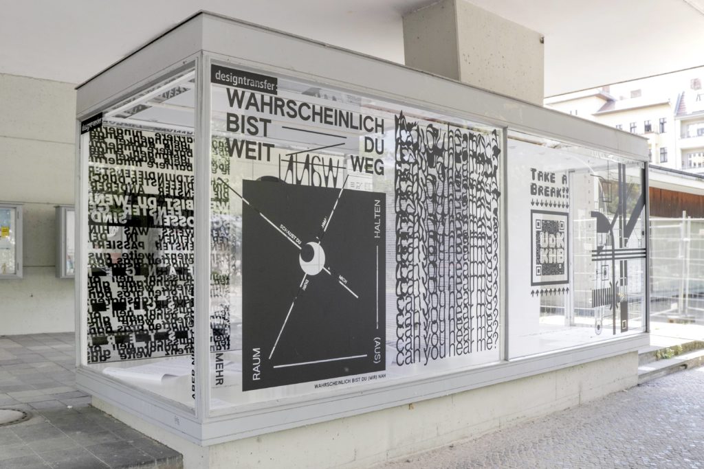 Im ersten Teil des Workshops wurde zunächst ein digitaler Austausch über Perspektiven angestossen – ob aus dem Fenster oder auf das Studium blickend; verschiedene Formen der Vorstellung wurden erprobt; gestaltend wurde geteilt – einen Kaffee, eine Idee oder auch Frustrationen und Zweifel. Anschließend entwickelten Gruppen aus dem gemeinsam generierten Material typografische Ideen und bereiteten diese zur räumlichen Inszenierung auf. Der finale Teil des Kurses widmete sich dann der Produktion vor Ort, nicht an Bildschirmen, sondern an den Glasscheiben der Ausstellungsvitrine des designtransfers.