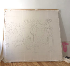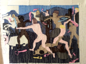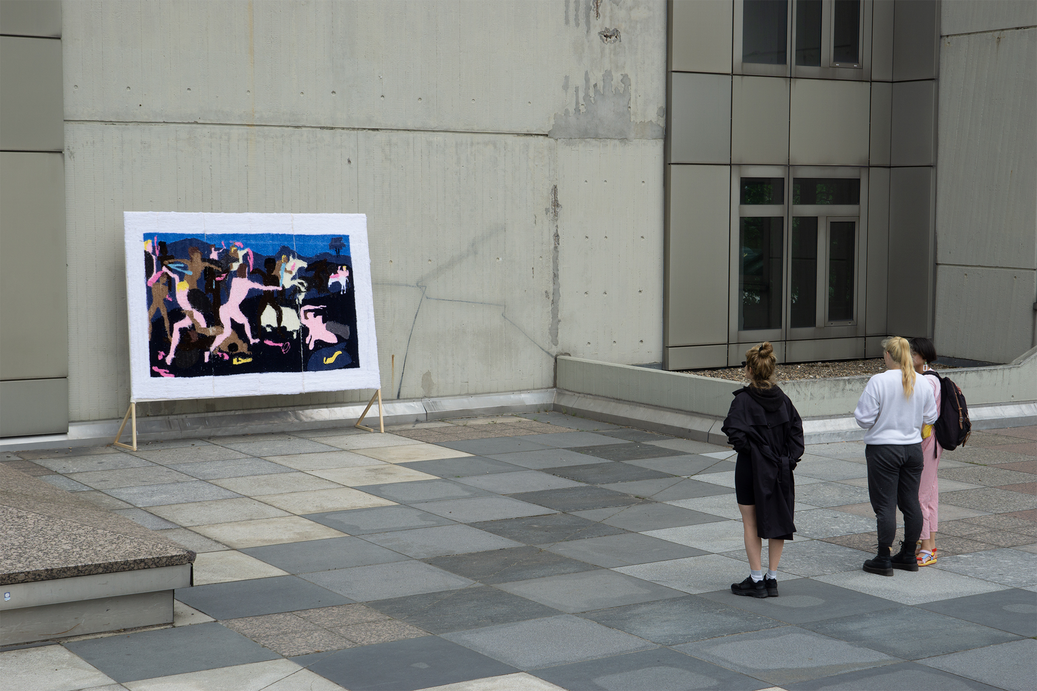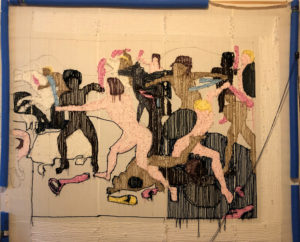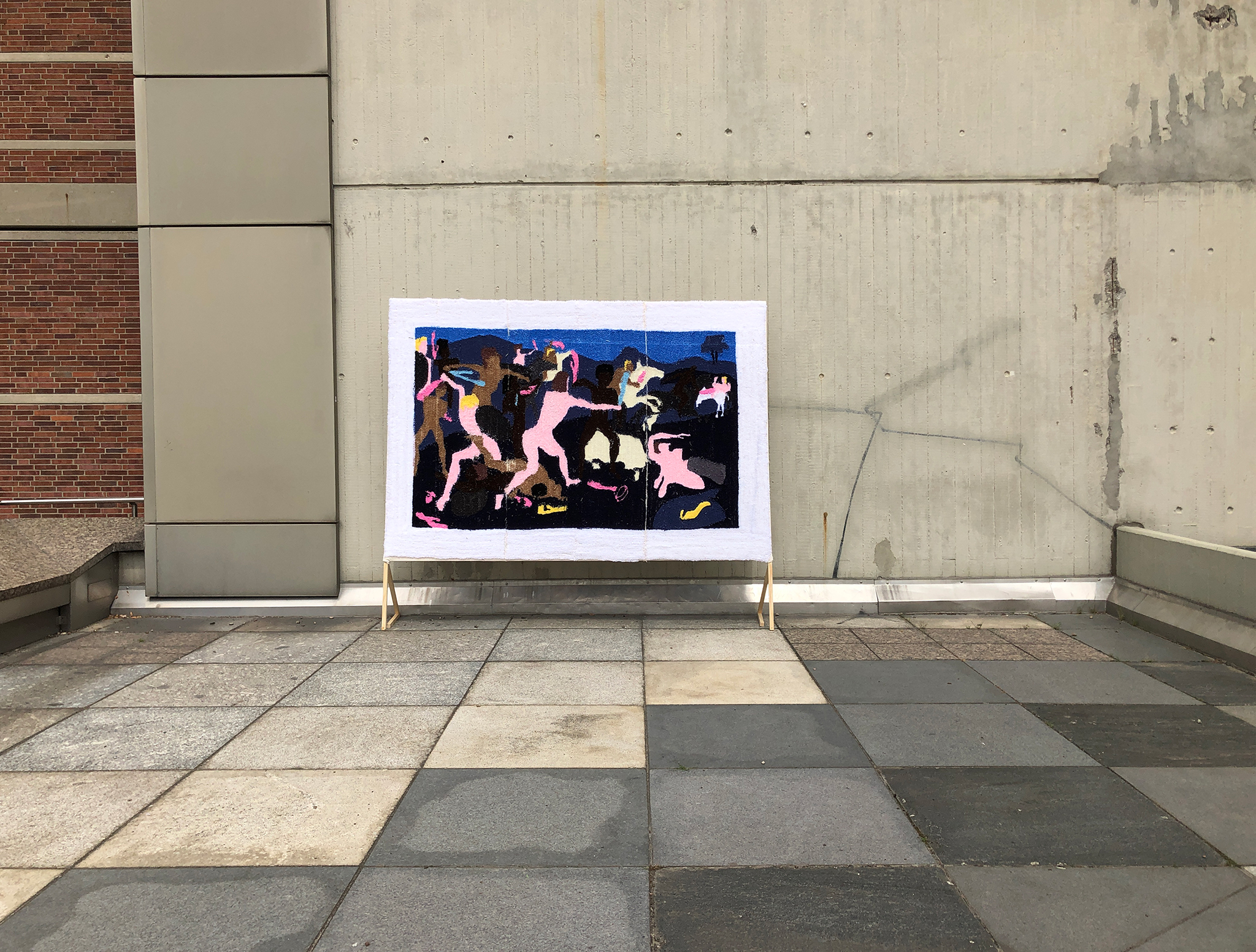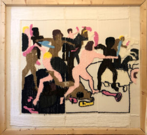 The tapestry in large format impedes the brutal war depiction of the original with its fluffy haptics and breaks with the traditional portrayal of epics, by the warriors being deprived of their armour and their weapons being substituted with colorful vibrators, which makes them seem ridiculous. The absurdity of war becomes evident as men being at each other’s throats with phallus-like penis substitutes to demonstrate power. The work can be seen as a miscevious commentary about the patriarchy from a feminist point of view.