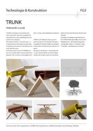 The semester projekt for the students was the design and constructive development of a connector which enables very different object and product characteristics. New and individual furniture typologies on topics such as storage space, table surfaces or seating furniture were to be considered. A complete furniture system was to be created by combining intelligent connectors with semi-finished products and sheet materials. After an intensive conceptual discussion using mind-mapping, we developed a comprehensive conceptual map, which served as a basis and starting point for the design process. After the constructive elaboration of the designs, the development of the designs into a physical prototype followed as an important part of the seminar. The simulated product development was rounded off by requests for quotations from possible suppliers.