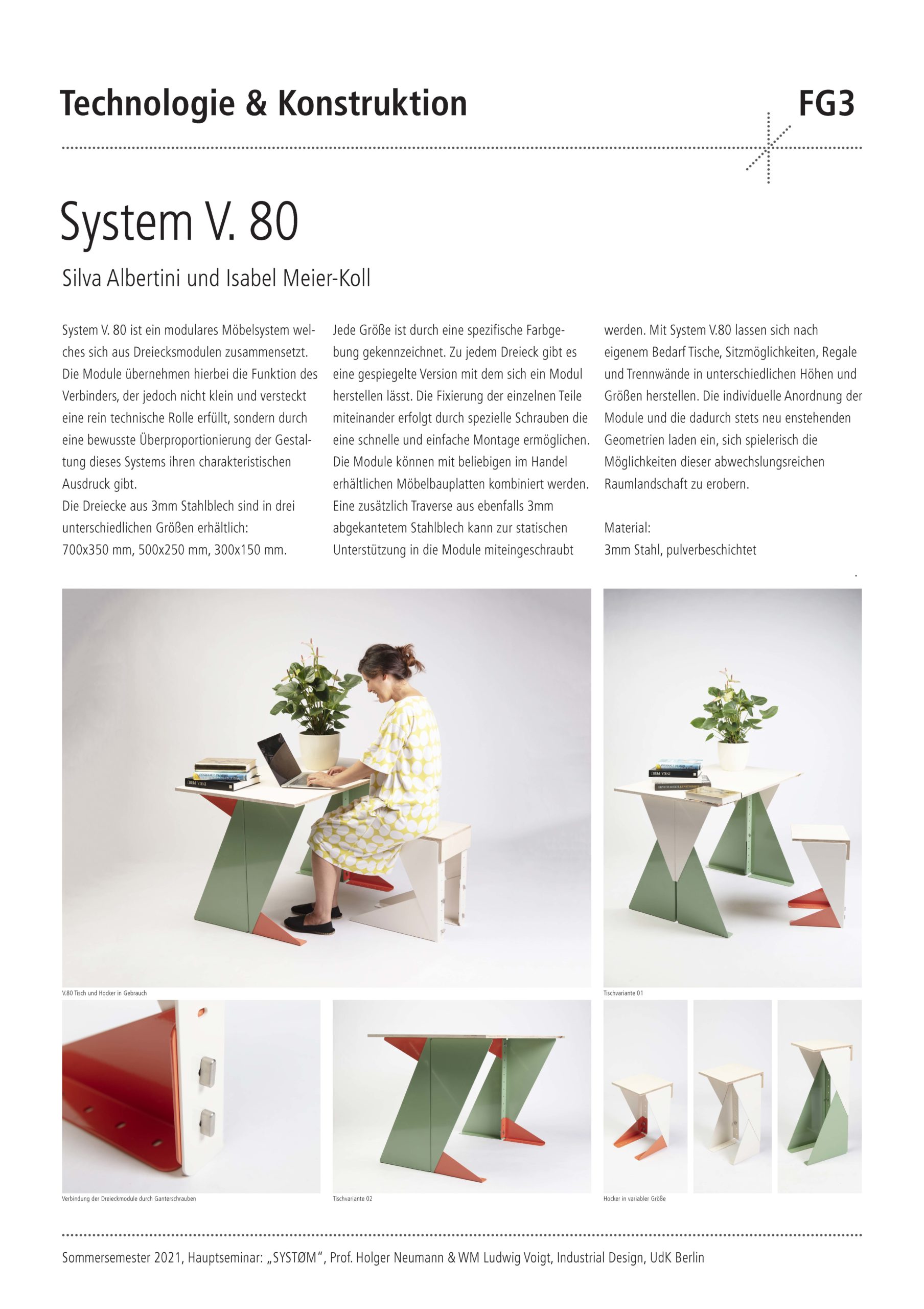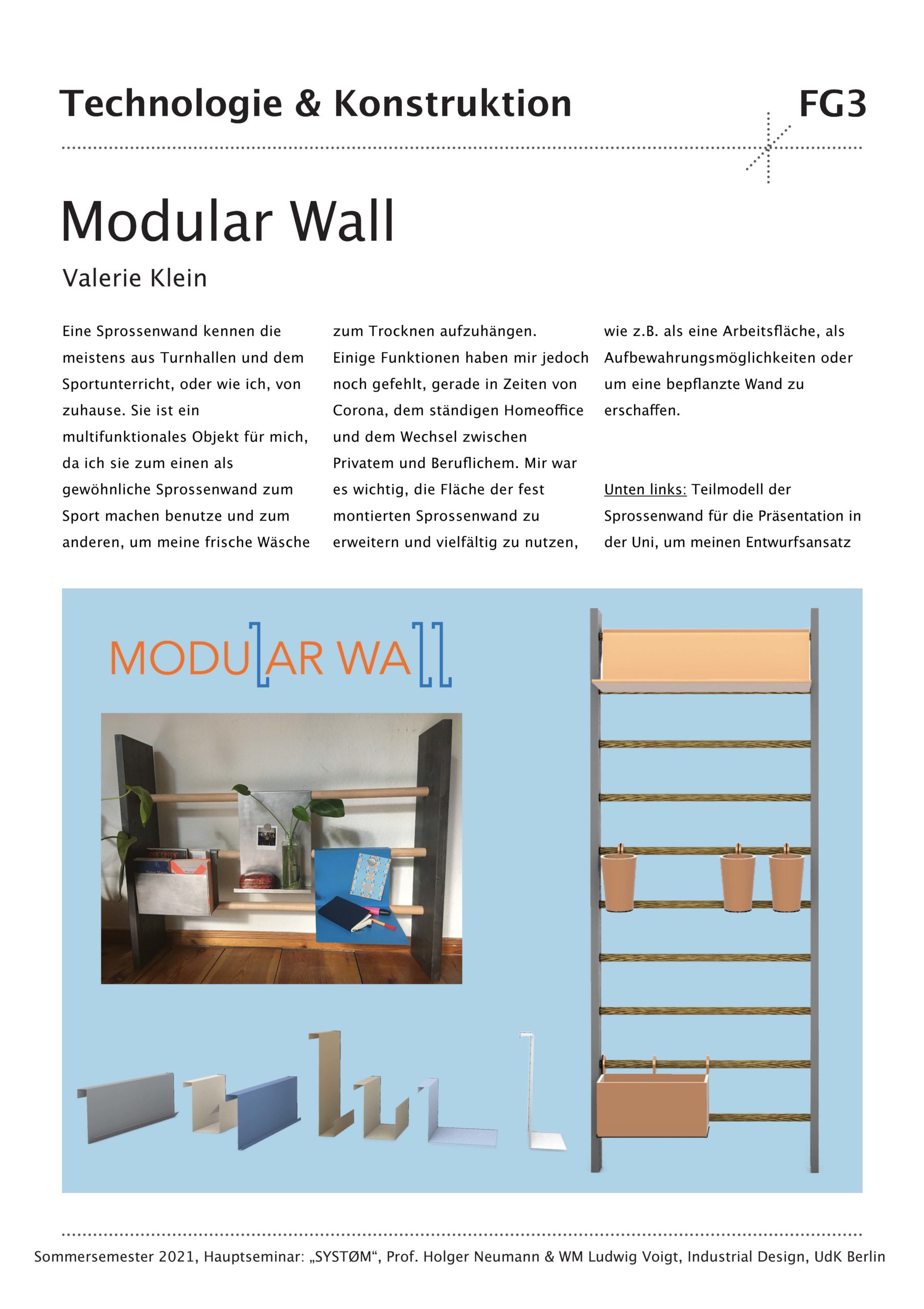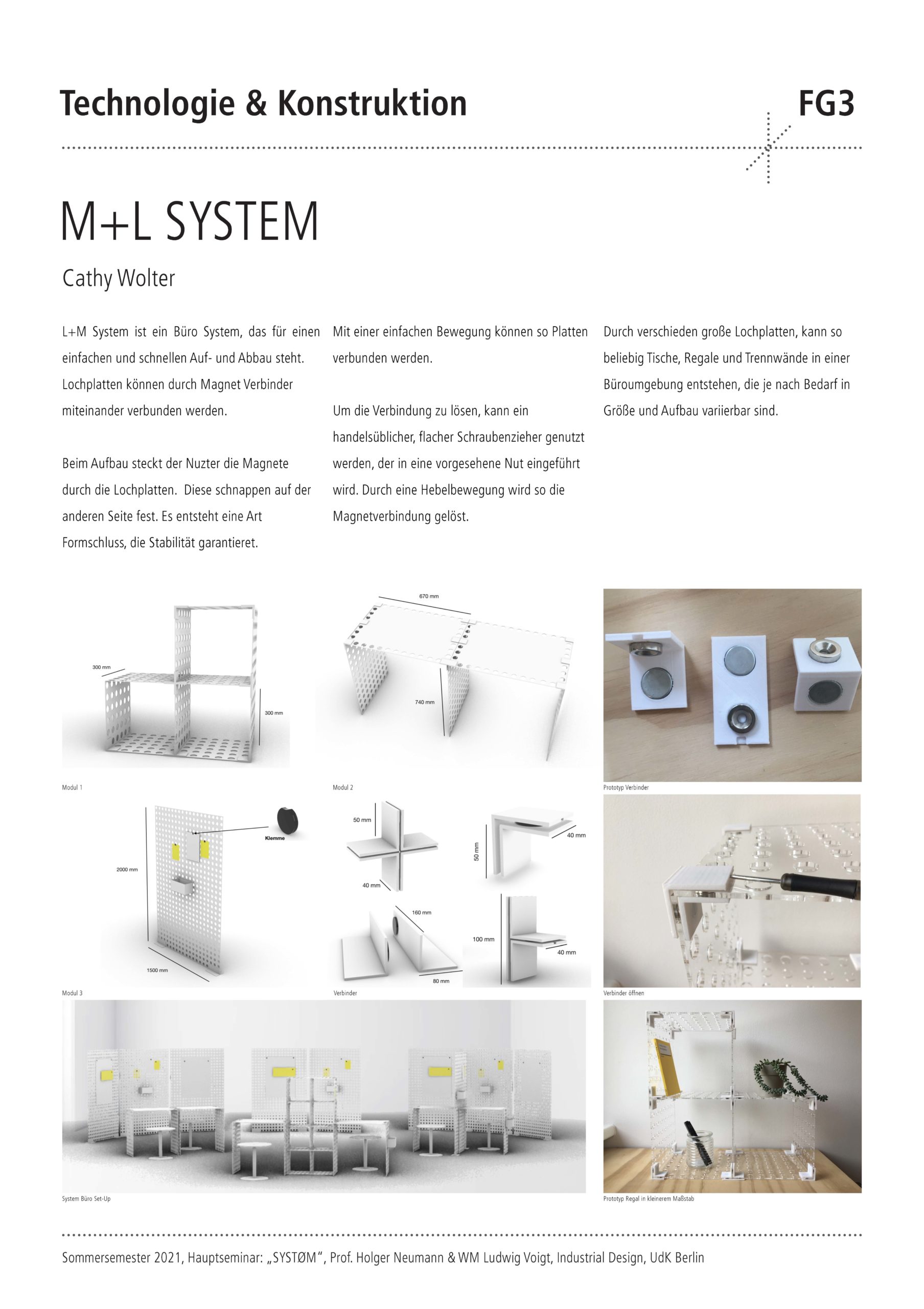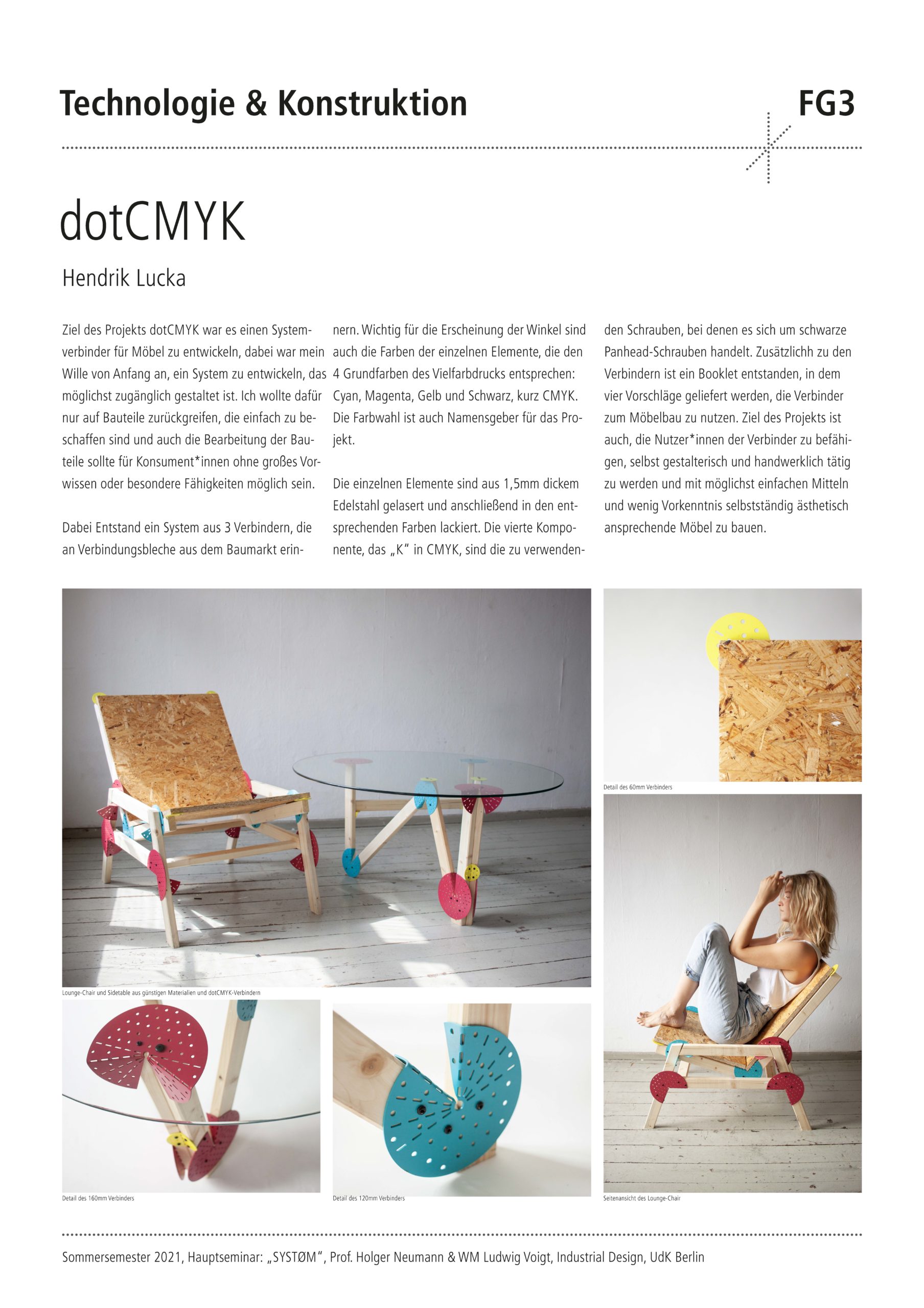 Das Semesterprojekt für die Studierenden war der Entwurf und die konstruktive Entwicklung eines intelligenten Verbinders, der ganz unterschiedliche Objekt- und Produkteigenschaften ermöglicht. Es sollten neue und individuelle Möbeltypologien zu Themen wie Stauraum, Tischflächen oder Sitzmöbel betrachtet werden. Durch die Kombination eines intelligenten Verbinders mit Halbzeugen und Plattenmaterialien sollte ein komplettes Möbelsystem entstehen. Nach einer intensiven konzeptionellen Auseinandersetzung mittels Mindmapping wurde eine umfassende Conceptual Map entwickelt, die als Grundlage und Ausgangspunkt für den Entwurfsprozess diente. Nach der konstruktiven Ausarbeitung der Entwürfe folgte als wichtiger Teil des Seminars die Entwicklung der Entwürfe zu einem physischen Prototyp. Die simulierte Produktentwicklung wurde durch die Einholung von Angeboten bei möglichen Lieferanten abgerundet.