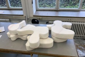 Die gewundene äußere Form der einzelnen Kissen ist unterschiedlich stark ausgeprägt. Manche engerlaufenden Wölbungen stießen bei der Weiterverarbeitung an ihre Grenzen. Dennoch konnte über mehrere Versuche ein passendes Endresultat erzeugt werden.