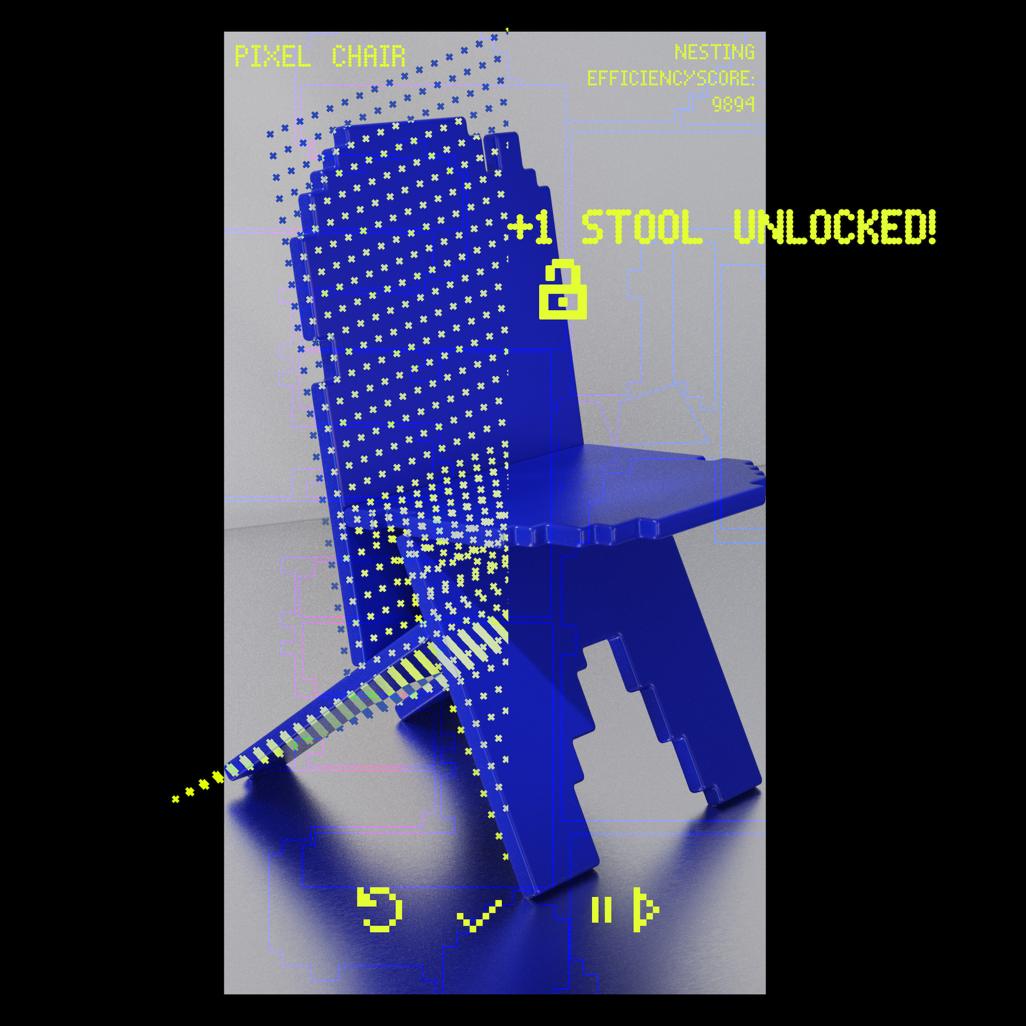 The script can be seen as a concept for a game/app in wich users can design their own chair in an augmented reality app and achieve a „nesting score“ by erasing pixels of the chair. The basic design of the chair fits on a quarter of an industrial 25mm fibreboard (105 cm x 144 cm). When you play the game and modify the chair, the freed-up space then unlocks bonus objects like a stool or a wardrobe.