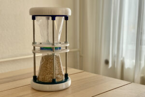 The Lock Clock is an hourglass that can be used to control the speed of the flow of time. Most of the material is made by 3D printing, using stainless steel rods for connection and stabilisation. The funnel is made of PVC film and is held in place by two lids at the top and bottom. The special feature of this hourglass is the central device, which resembles a camera opening and allows the outlet to be adjusted according to the user’s needs. The inspiration for this design comes from photography, where I have used the principle of the aperture to regulate the incidence of light. This allows the speed of the grain of sand inside the hourglass to be adjusted. Through simple operation, the user can precisely control the flow speed and thus influence the timing. You may need one minute of timing when cooking, while the next dish only needs 30 seconds. It is inconvenient to turn the hourglass over several times to measure 5 minutes, for example. Different application scenarios require different timing needs. By adjusting the Lock Clock, you can achieve your goal effortlessly. Perhaps you are in a wonderful moment and by simply turning the hourglass you can seemingly extend the time. Anyone can become a master of time!