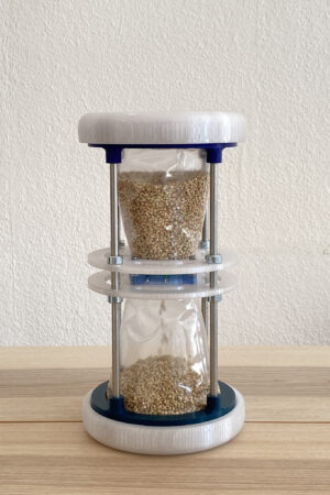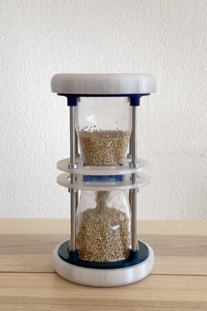 The Lock Clock is an hourglass that can be used to control the speed of the flow of time. Most of the material is made by 3D printing, using stainless steel rods for connection and stabilisation. The funnel is made of PVC film and is held in place by two lids at the top and bottom. The special feature of this hourglass is the central device, which resembles a camera opening and allows the outlet to be adjusted according to the user’s needs. The inspiration for this design comes from photography, where I have used the principle of the aperture to regulate the incidence of light. This allows the speed of the grain of sand inside the hourglass to be adjusted. Through simple operation, the user can precisely control the flow speed and thus influence the timing. You may need one minute of timing when cooking, while the next dish only needs 30 seconds. It is inconvenient to turn the hourglass over several times to measure 5 minutes, for example. Different application scenarios require different timing needs. By adjusting the Lock Clock, you can achieve your goal effortlessly. Perhaps you are in a wonderful moment and by simply turning the hourglass you can seemingly extend the time. Anyone can become a master of time!