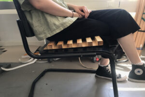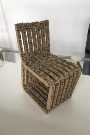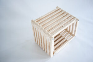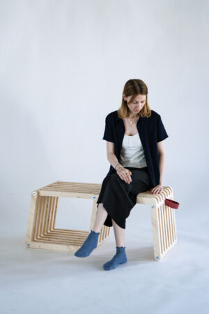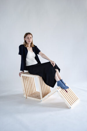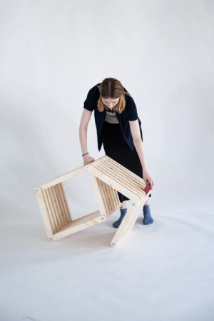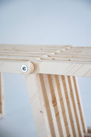 23 Winkel aus 3-Schicht-Fichtenholz bilden die Grundlage der Konstruktion. Diese werden an drei Stellen durch Aluminiumrohre mit Innengewindeeinsätzen an den Seiten verschraubt, sodass immer sieben bzw. acht Winkel nebeneinander angeordnet sind. Zur Stabilisierung werden an drei weiteren Stellen, ebenfalls durch Aluminiumrohre, runde Holzscheiben eingesetzt, die auch überall den gleichen Abstand zwischen den Winkeln gewährleisten. An einer Verbindungsstelle ist zwischen den Abstandhaltern ein Lederstreifen eingearbeitet, der als Griff dient. So kann man an genau der richtigen Stelle zugreifen und bequem und ohne viel Kraft eine Seite der Bank nach oben klappen, um den Stuhl mit Rückenlehne zu nutzen, oder nach unten, um den „Stubenhocker“ auch wortwörtlich in einen Hocker zu verwandeln.