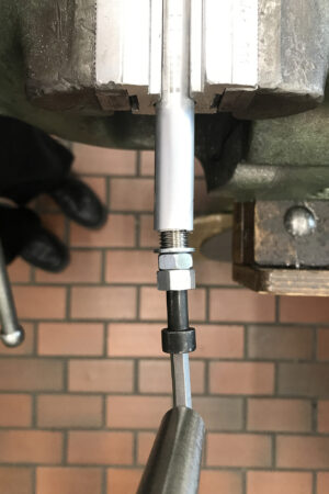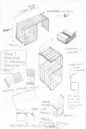 23 angles made of 3-ply spruce form the basis of the construction. These are screwed to the sides at three points by aluminium tubes with internal thread inserts, so that there are always seven or eight angles next to each other. For stabilisation, round wooden discs are inserted at three other points, also through aluminium tubes, which also ensure the same distance between the angles everywhere. At one joint, a leather strip is inserted between the spacers, which serves as a handle.This means that you can grab it at exactly the right position and comfortably and without much force fold one side of the bench upwards to use the chair with a backrest, or downwards to literally turn the „Stubenhocker“ into a stool as well.