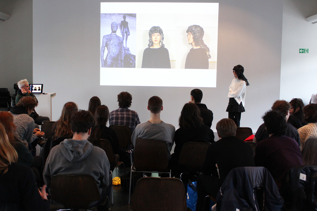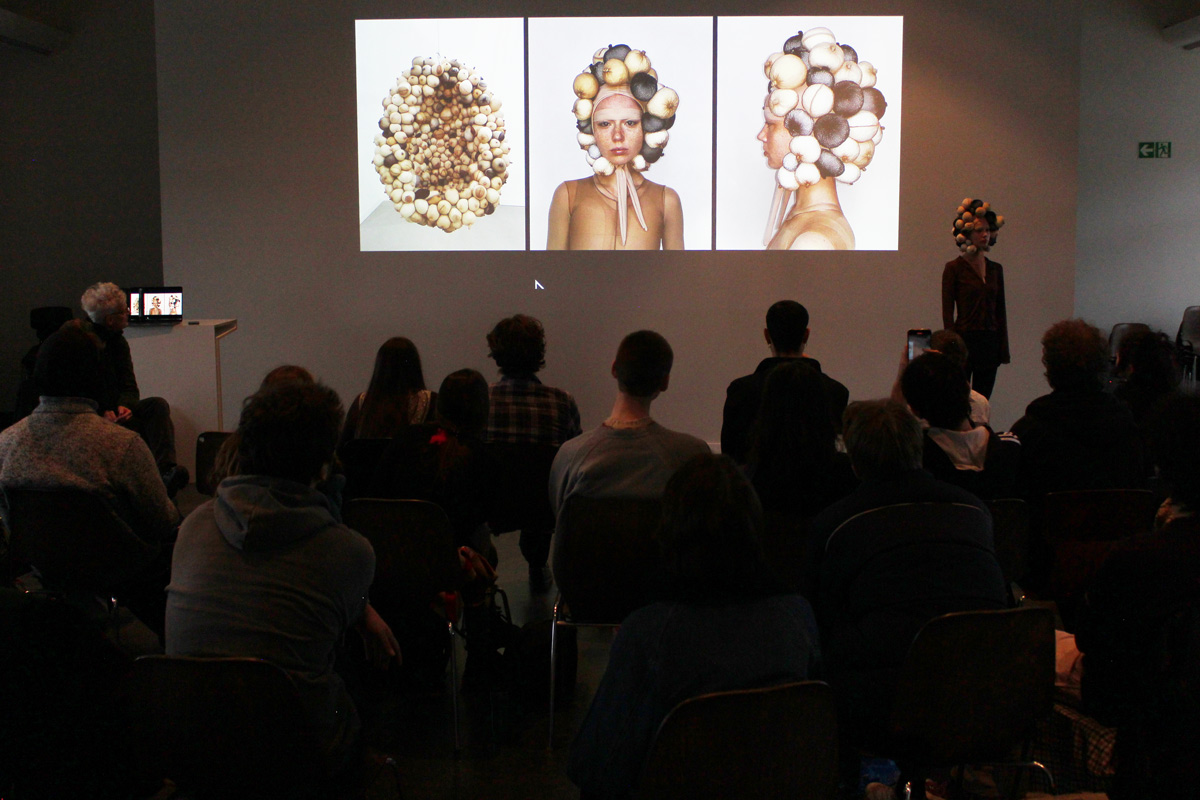 Ein Kopfobjekt (Hut, Mütze, Haube, Kaputze, Kopfschmuck, abstrakt etc.) nach ästhetischer Vorgabe für deinen Kopf mit Material, das überwiegend zu deiner Werkstatt diese Woche passt.
