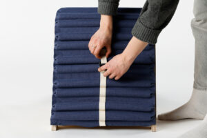Der Designprozess fokussierte sich auf zwei Positionen: Das Liegen auf der Matte mit hochgelegten Beinen; Das Sitzen auf der Matte, angelehnt an den Hocker. Beide Positionen können positive Effekte auf den Körper haben und dessen Gesundheit fördern.