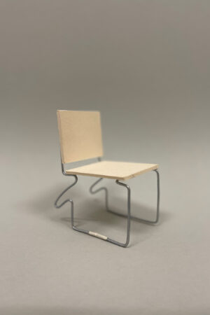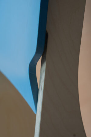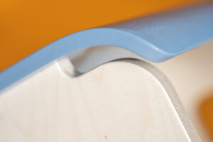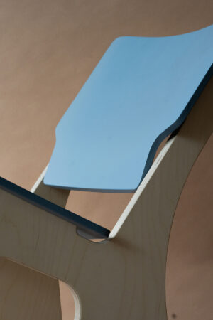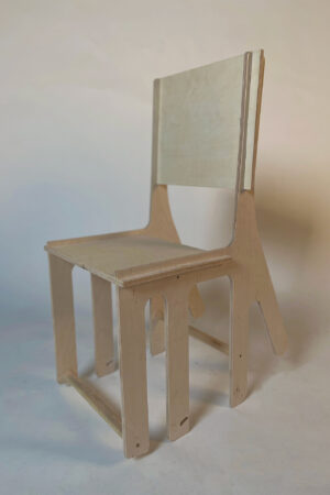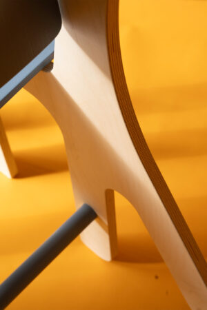 Der Stuhl ist gefertigt aus zwei gefrästen Holz-Multiplex Platten und zwei Formholzteilen und einer ergonomischen Rücken- und Sitzlehne.